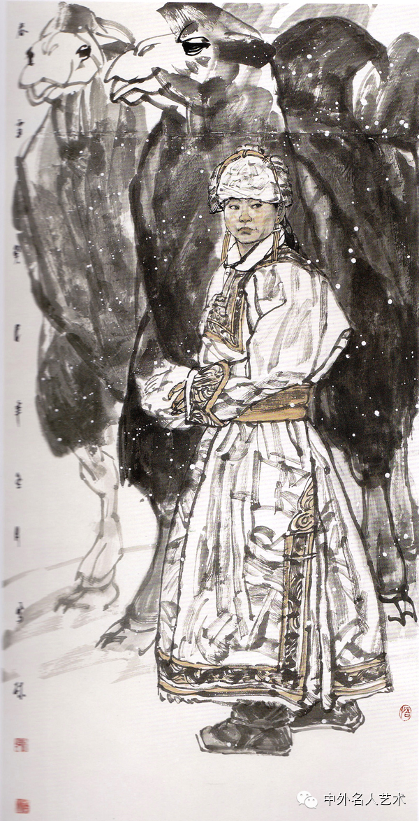 《蒙古长调》《永恒的长调》《达尔罕风情》《哈达·祝福》《飞雪迎春到》《试装》等作品,均见出影神兼备、“笔墨加素描”的写实表现特点,在骨法用笔、笔墨齐下、气韵生动中见出一种充实丰满的韵致来。譬如《达尔罕风情》,便是实写与虚写的典型作品,人物以实写为主.却并无西画不分巨细的逼真刻画与塑造,而是在确立构图_与人物动态中.以笔墨皴擦出素描般的明暗变化与层次,较之传统人物画的画法、程序,显然更趋于具象的结构、空间与形体的描绘。人物依然是线面结合,不难看到,人物,骆驼的笔线在干湿浓淡中游动,在一波三折中显现节奏、韵律与力度,牧女面部全无传缓“凸凹法”的旧貌,代之以结构素描的皴擦、渲染,而人物身着蒙古袍的褶皱与骆驼的躯体,则是率性的笔墨齐下的尽兴铺展,看似无序,任意挥洒.实在烂熟于胸,极具分寸,恰到好处地表现了不同质地与质感。背景则以虚写的空白为主.使空间更广阔、更深远,审美想象在此得以无限延展,如此的虚实结合,使画面全无斧凿雕琢之感.既显示了笔墨之美,作品整体又表现出节奏流畅的神韵四溢的现代诗意,鲍凤林在“笔墨加素描”的手法中,解决情感与结构、形态与体积、意象与具象的关系,并更重视动静,虚实关系的处理,使作品在形神兼备的同时,尽显中国画的美感与主题诠释的魅力。《蒙古长调》《永远的长调》《试装》《哈达·祝福》等都显示出画家的艺术感受力和非同寻常的表现能力。