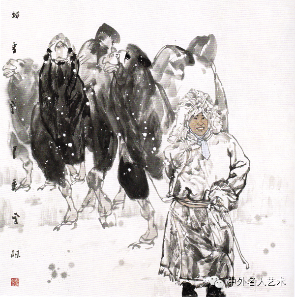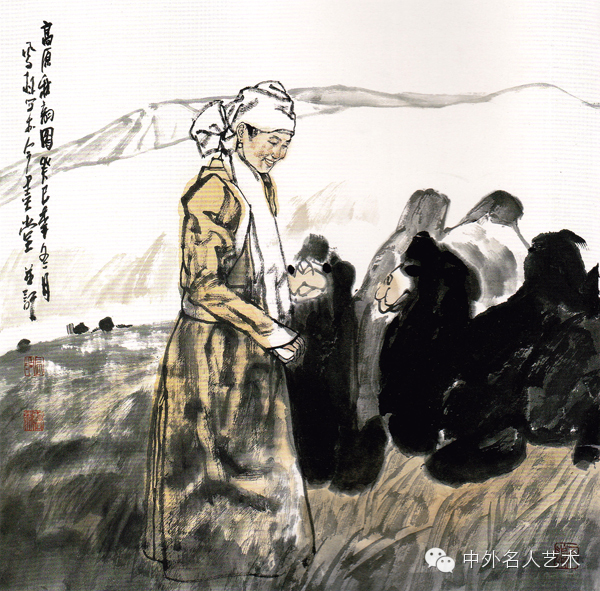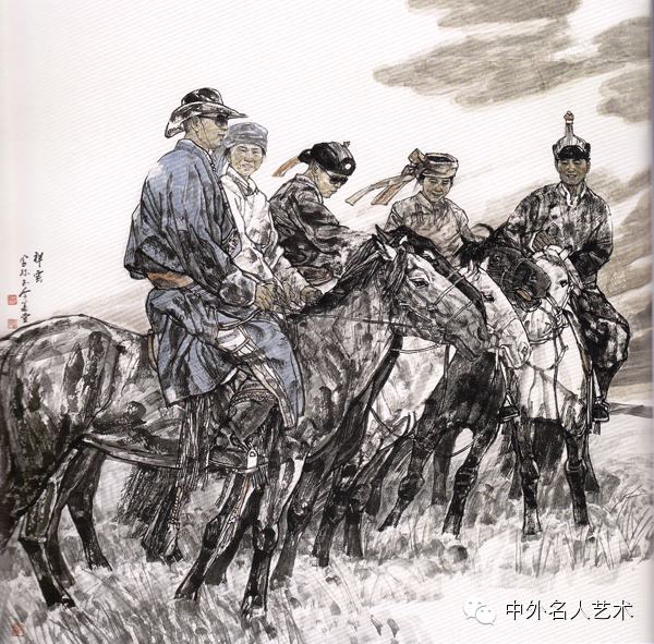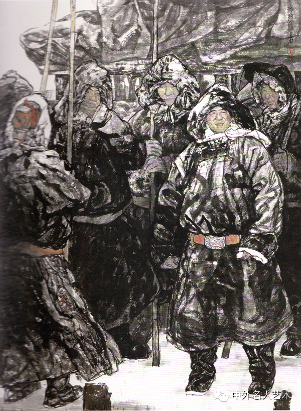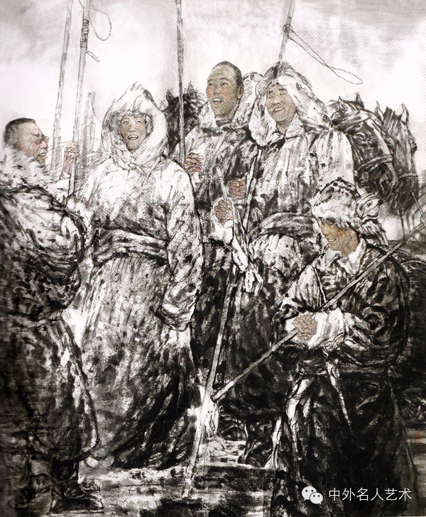 在《哈达·祝福》中,画家以宏大场面、众多人物组织画面,以“笔墨加素描”的手法极力渲染草原盛会的气息与氛围,画面呈水平状横向展开,众多人物的不同动态,或前后呼应,或左右顾盼地分布在近景与中景上。作品不特别强调空间纵深感,尽力在二维半空间内结构史诗般恢宏与阔大,不同人物、不同神态与表情,在画面中获得整体的浑然。画家以中锋用笔加结构皴擦出素描关系,更有力于形神与气韵的刻画与表现;在整体的构成关系中,黑白灰的人物组合,互为映衬,互为依托;画家着重刻画了蒙古汉子的租犷、雄健的生命光彩与魅力,又以细腻笔致描绘蒙古女子的温情与坚韧天性,在簇拥与怀抱中,凸显出中左部互致祝福的两位主要人物;在劲健的用笔、结构的皴擦、明暗的配置以及笔法、墨法、笔型、墨色的综合运用中,画面被营造得有声有色,而写意的用笔则使画面洒脱灵动、虚实互动之间产生的张力溢出画面有限空间,在繁简之中让人领悟了意味深长的人与自然的关系。