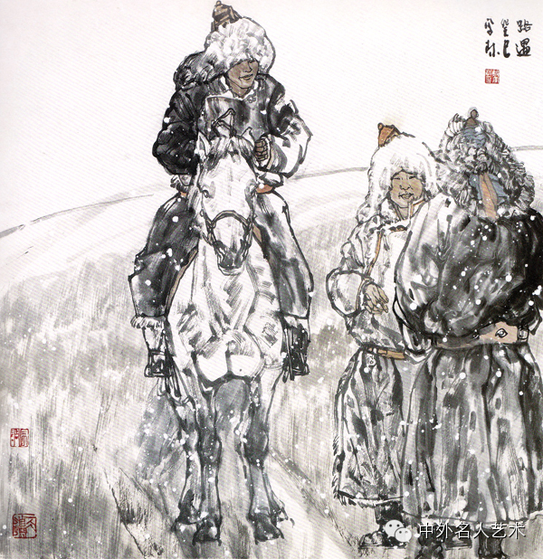 “审美尺度”是艺术自觉与目归艺术本质的必然标准与产物,鲍凤林的作品在岁月雕琢与时光沉淀中去粗取精、删繁就简,日渐精到,整体把握与局部描绘渐显出娴熟与自我风格。在聚焦于日常生活的平凡诗意中,他笔下的普通人和平凡劳动者展示出草原民族特有的纯朴、憨厚与强悍,画家并不刻意于剑拔弩张形式的乏力强调,而是在寻常生活与劳动中刻画血肉丰满、雄健阳刚的生动形象与气韵生机,在最普通与最日常状态中刻画了草原父老乡亲的天性与品格。作品表明,画家的艺术自觉表现在他的“为人生”的艺术选择的不离不弃与渐行渐远,他学习、借鉴与继承了近代艺术大师徐悲鸿、蒋兆和开创的艺术风格与特点——“笔墨加素描”的方法,以贴近人生现实,表现生命的郁勃,在现实中提取感性生动的生命影式.这些全新的意象和境界刷新了传统水墨人物画对审美意识。在这些作品中,如《蒙古长调》《永远的长调》《高原风》《达尔罕风情》《试装》《季风》《草原母亲》《远方》《劝奶歌》《家人行》《行走平遥》系列、《哈达·祝福》等.