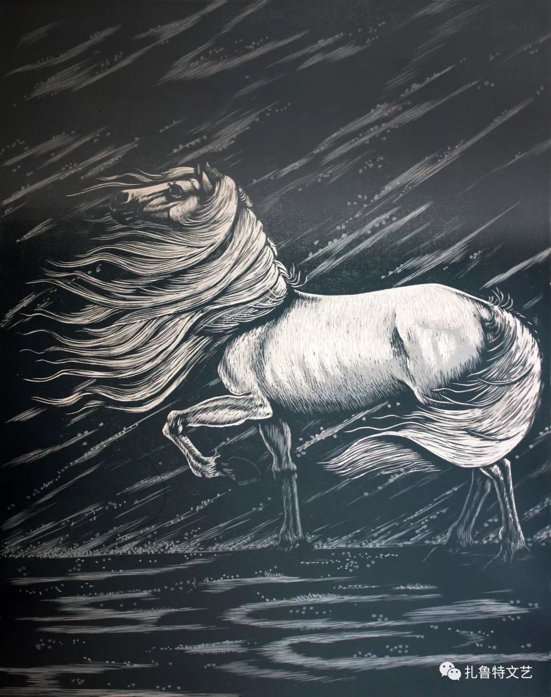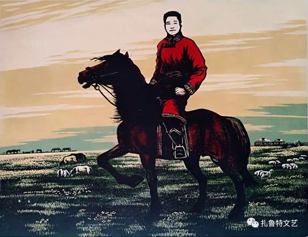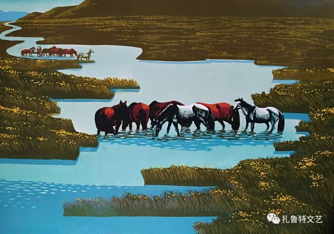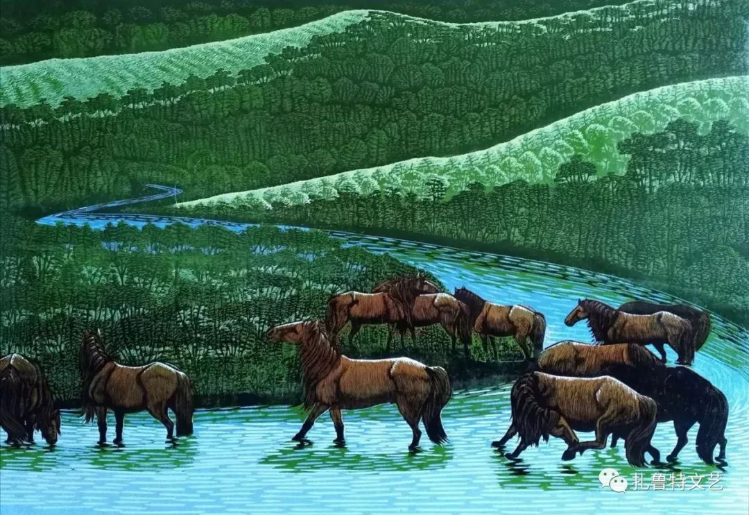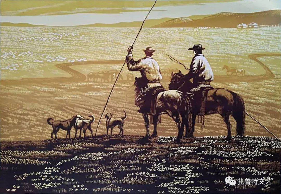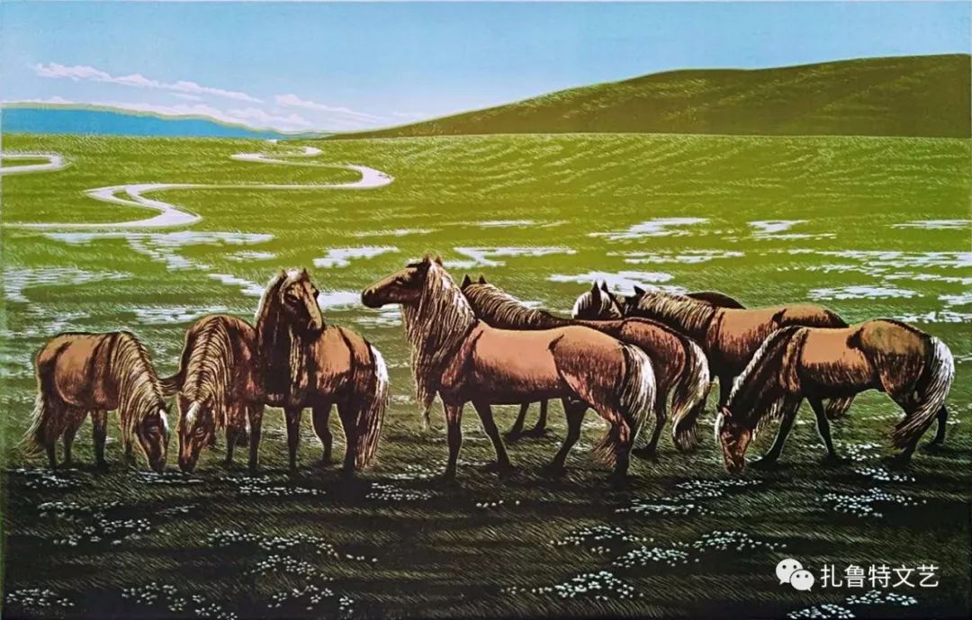 照那木拉的版画创作继承了扎鲁特版画的传统技法,在古朴中写实,在写实中赋予了作品的灵动和飘逸,其最大的特点就是真实的反映了扎鲁特的草原风光。
