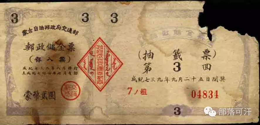 民国“蒙古自治邦政府交通部邮政储金票蒙币2元”连同抽奖票副联