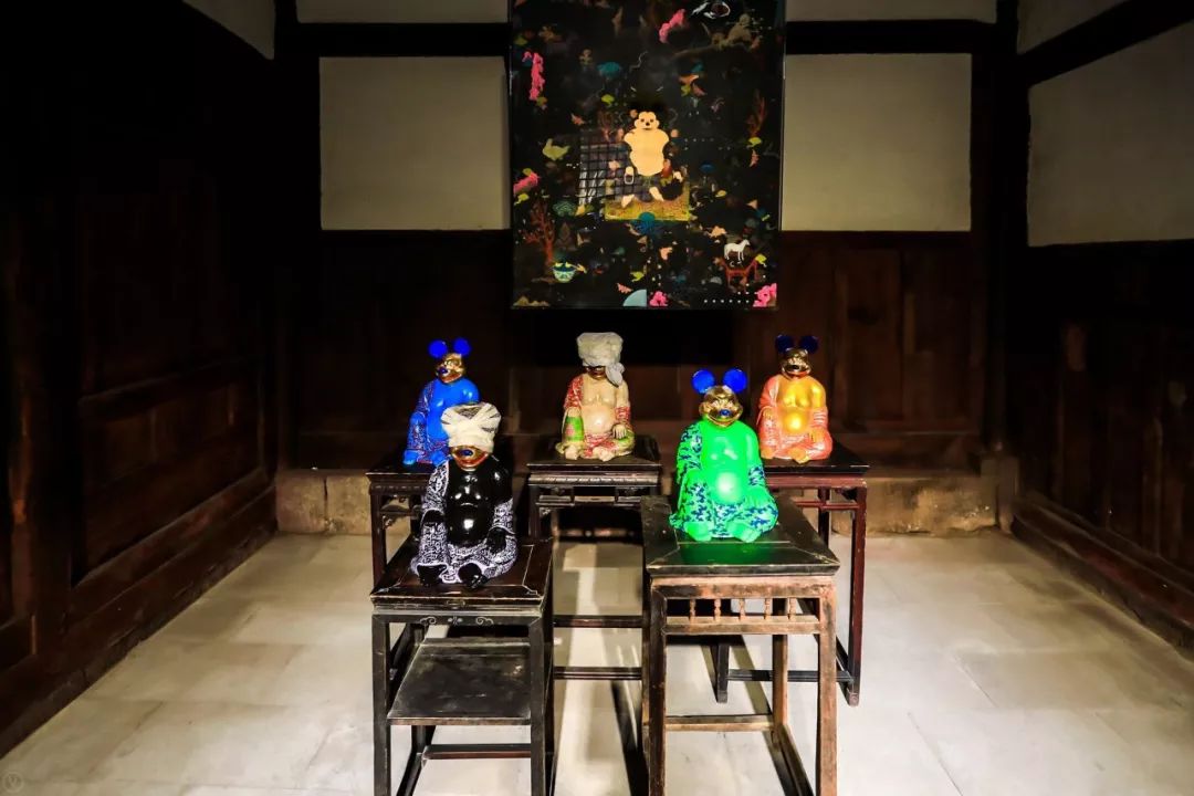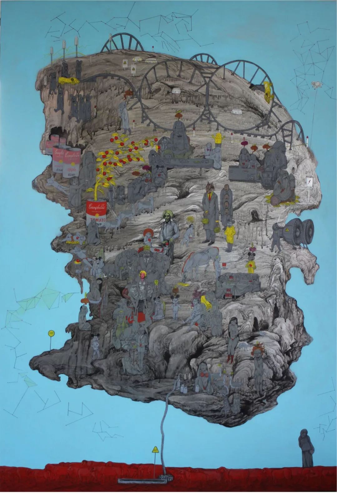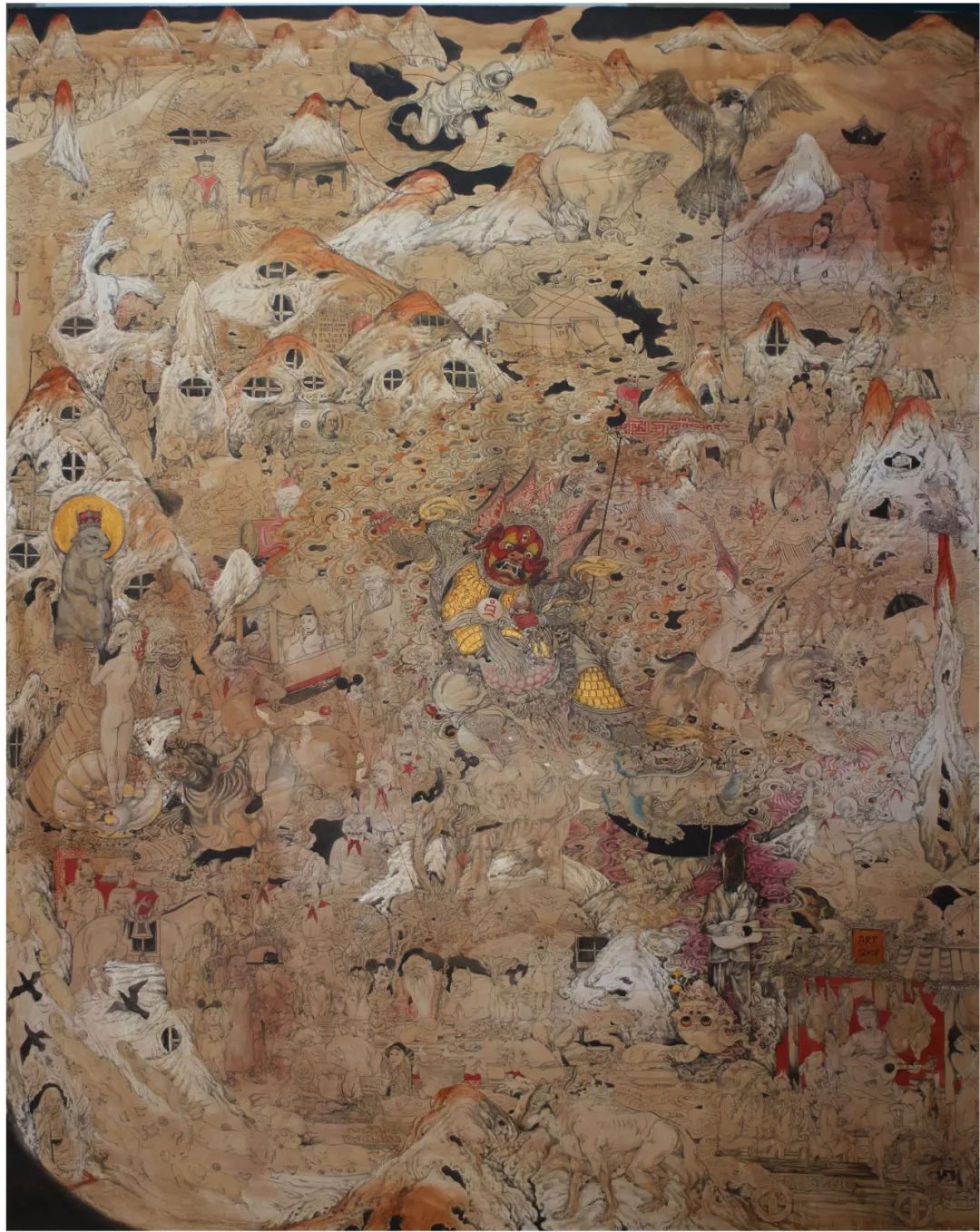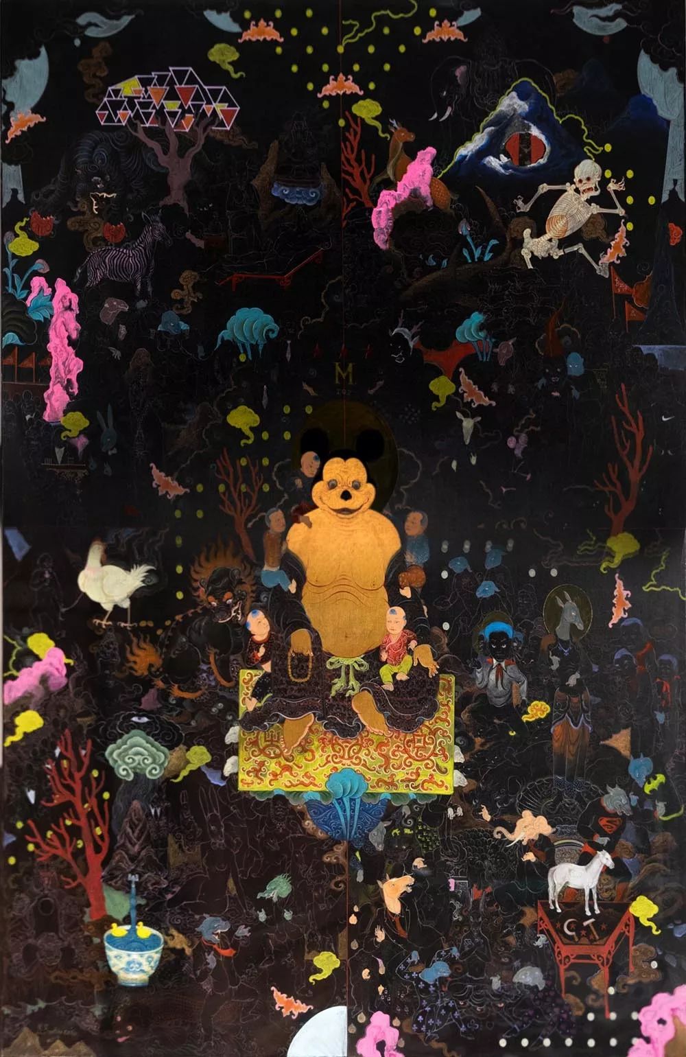 在《M...Top》和《他们》这两件作品中艺术家都运用了米老鼠的的形像和一些佛教故事以及弥勒佛身体,是一种传统的佛教崇拜和当下流行文化的组合。在绘画作品中艺术家也柔和和很多波斯细密画、唐卡 、俄罗斯油画的技巧。