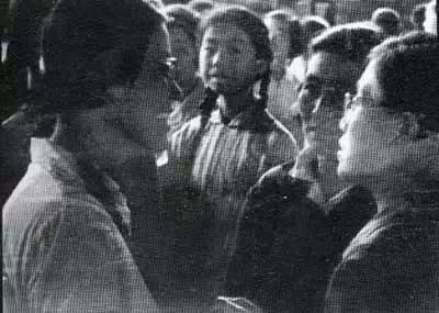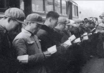1968年7月27日第三批北京知青赴蒙。永定门火车站前,同学送吴永明、程文斌、刘栋踏上北去的列车。