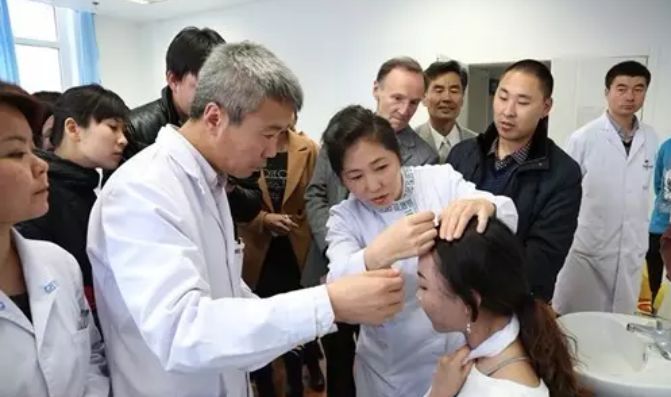 ▲乌兰在内蒙古国际蒙医医院针推科为考察组一行介绍蒙医放血疗法