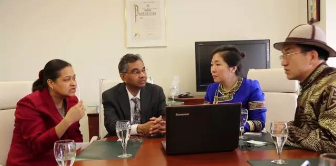 ▲乌兰(右二)向世界卫生组织驻纽约总部大使库玛·艾森(左二)介绍内蒙古蒙医药事业发展情况。