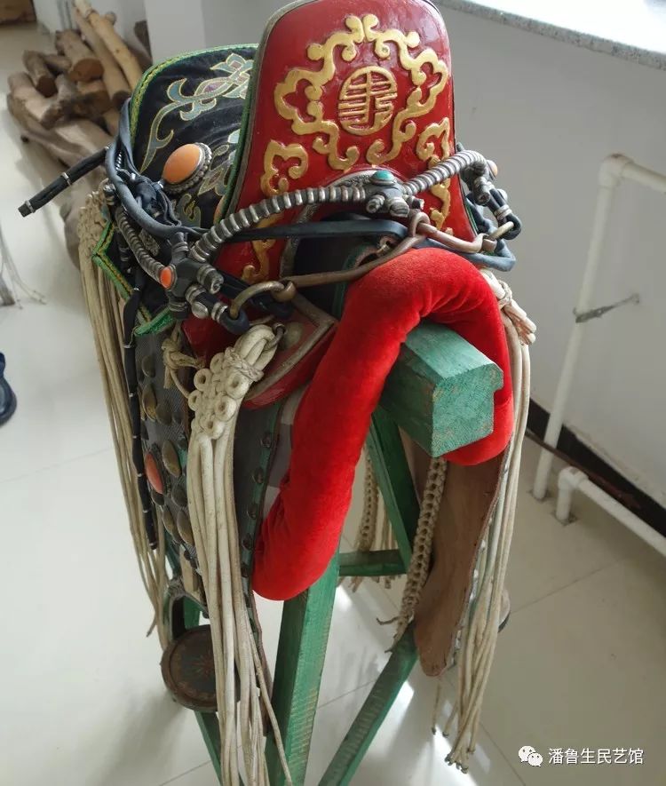作为“马背上的民族”,蒙古族对马具有着特殊的情感,鲍凤军的马具收藏也最为精彩,也很有说道。马鞍大小、形制、纹饰及配饰各有特色,马鞭有双龙头马鞭、木把马鞭、皮把马鞭、赶车鞭、骆驼鞭子等,绳类有八宝稍绳、缰绳、纲绳等,嚼挂有五花嚼挂、扎花嚼挂、双股嚼挂等,此外还有肚带、马拌、马镫、穗头、马龙头、头花等。其中,很多马具藏品自成系列,颇具收藏、研究价值,比如他收藏的元、契丹、清3个时期的马镫,制作工艺精巧、纹样装饰考究,都颇有讲究头儿。