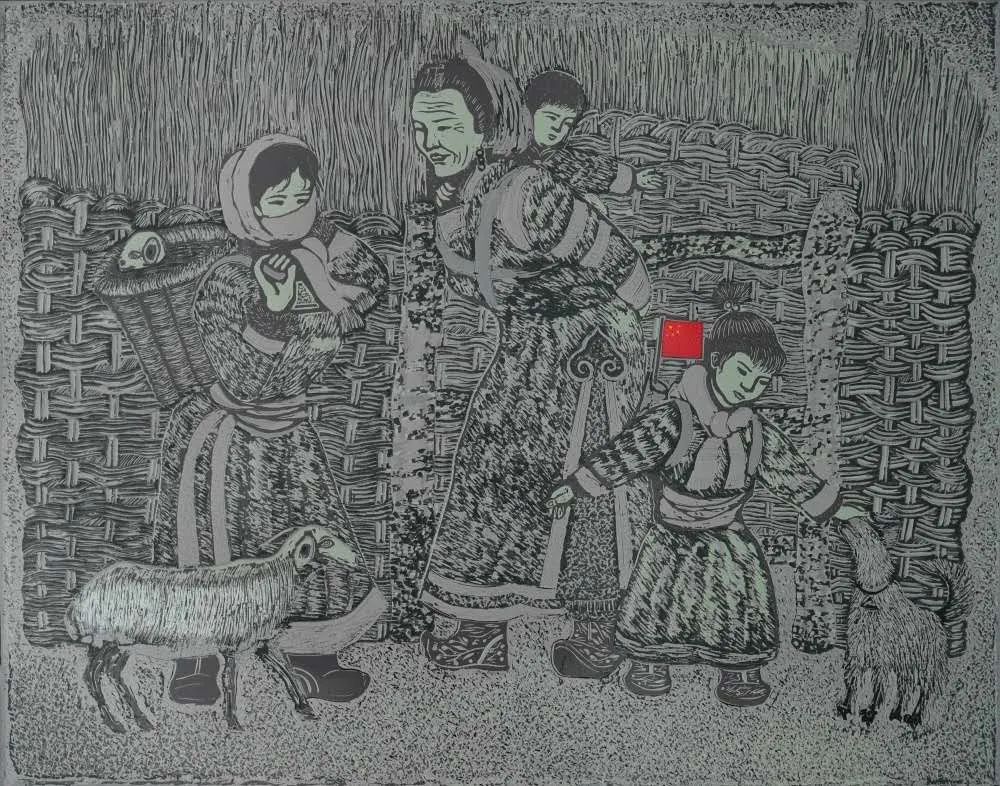 版画《欢庆盛事》(绘制:安阿丽古娜)