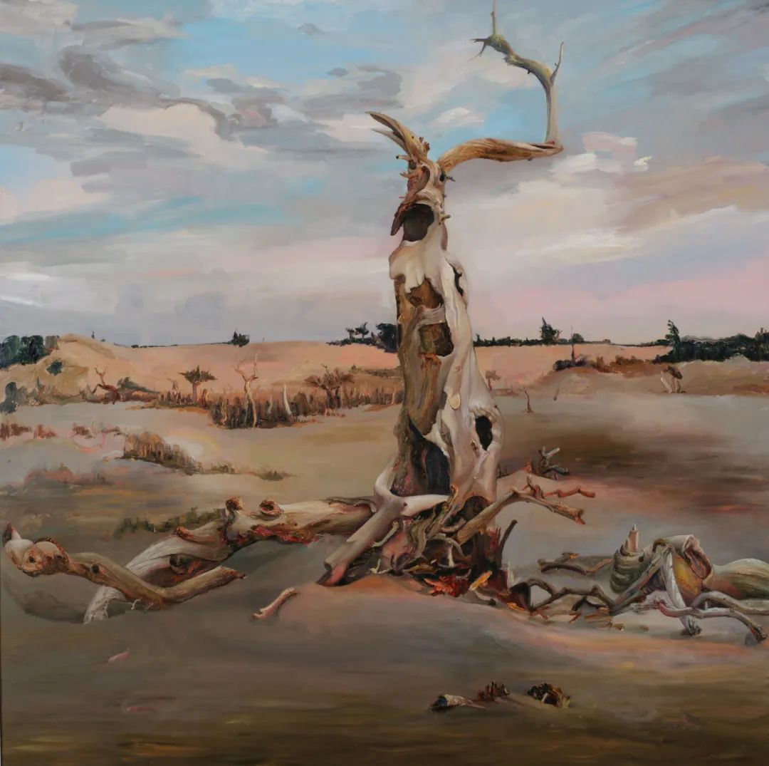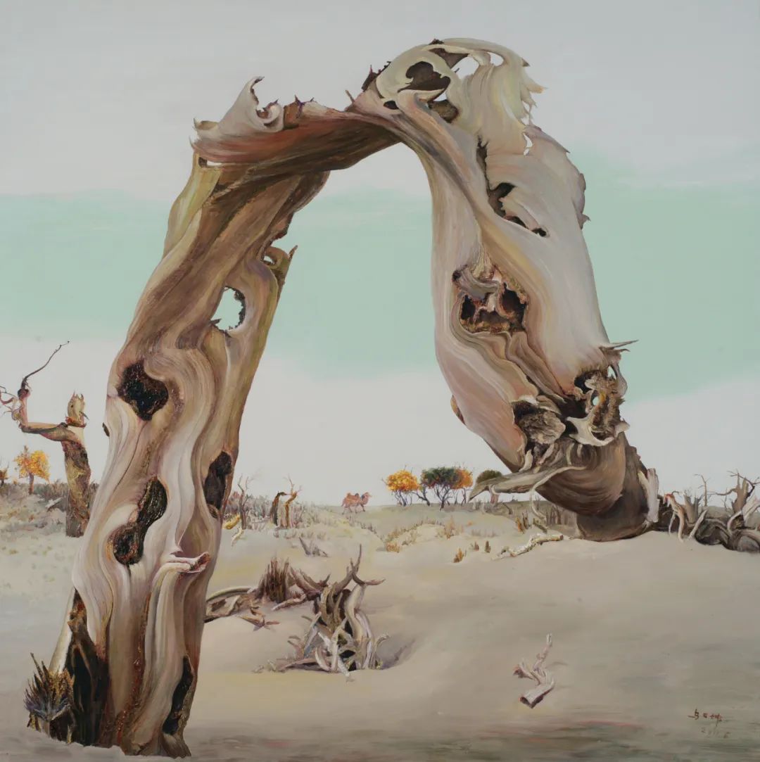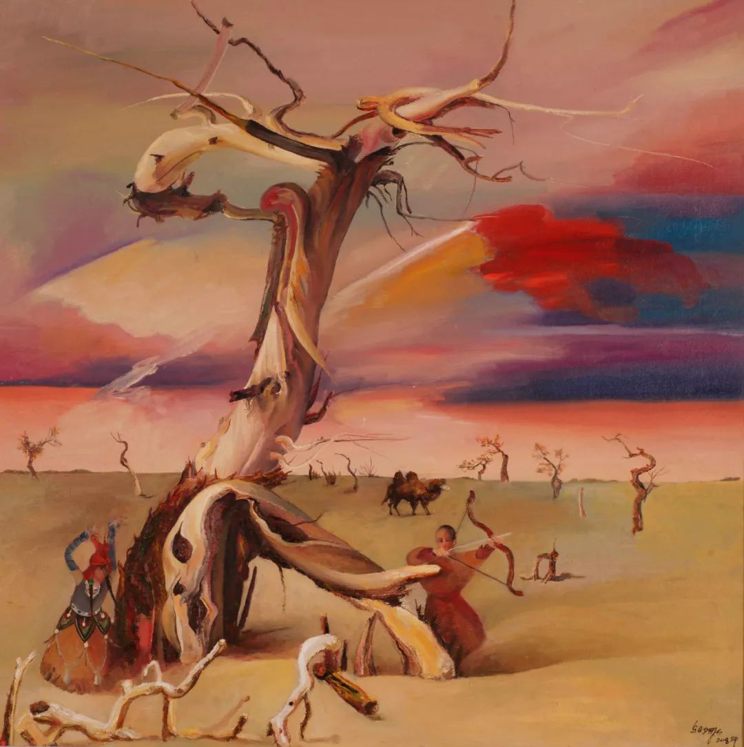 初次接触乌日娜的画作时,我并不知道她的名字,但真真地记住了她的这些画作。那是几十幅草原森林的油画,准确地说是她有一组有十几张画胡杨的画作,栩栩如生地竖立在我的面前,并深深地刻在我的脑海里。这些画,我是在阿拉善荒漠上,一排排枯死不倒的胡杨林前看到的。