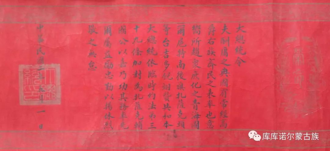 “青海霍硕特西右翼中旗公扎萨克,头等台吉图布坦扎木绰翊赞共和,本大总统以临时约法第三十九条,加封为扎萨克辅国公,以嘉乃功。其务率先尔属,益励忠勤,以扬休烈,敬之勿怠”。“中华民国二年五月一日 (大总统印)”。