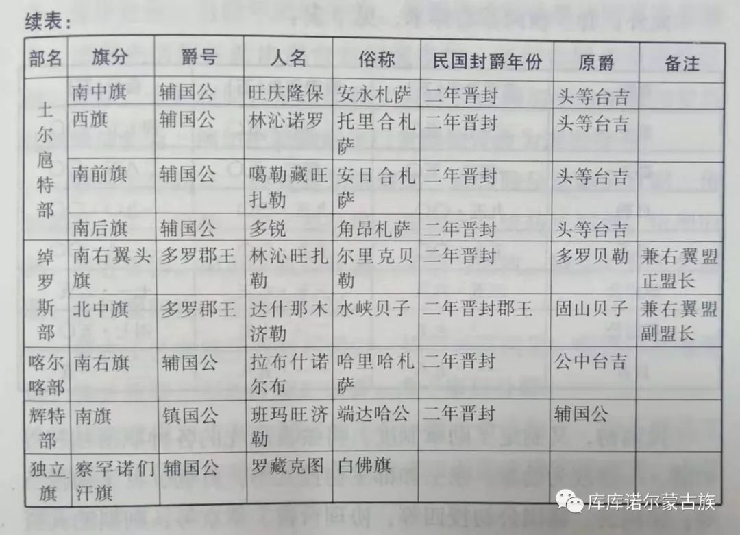 蒙古王公袭封、晋爵、俸禄和岁贡。蒙古王公承认共和后,袁世凯政府依例准予袭封晋爵,以各明旗呈报之宗系图谱为据,承认其爵职承袭,又不拘泥于前清旧例。据前清旧例,蒙古札萨克王公,原为世袭。民国二年十二月二十三日大总统令有云:“但当倾日边境多事之时,欲优赏酬或特别进封之事,日有所闻。将来如有遗爵遗职之时,设据新封之例实行世袭,恐无所谓制限。故自民国以后,一切蒙古各王公之进封,皆限于一位,以替世袭。”在青海各旗中共封亲王3名,郡王5名,镇国公4名,辅国公17名,左右正副盟长4名。兹列民国初年青海蒙古王公封爵简表: