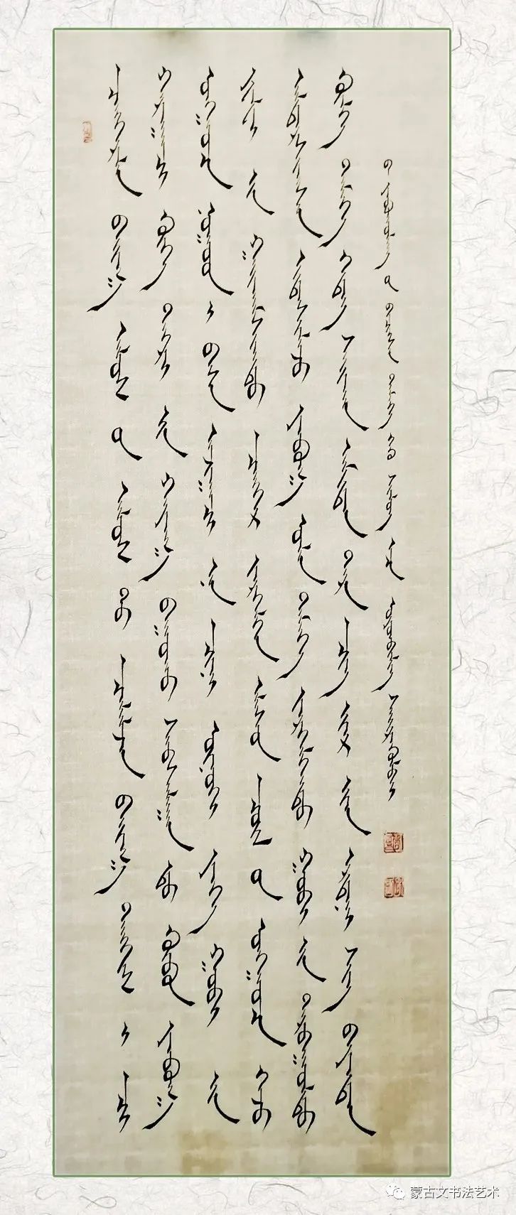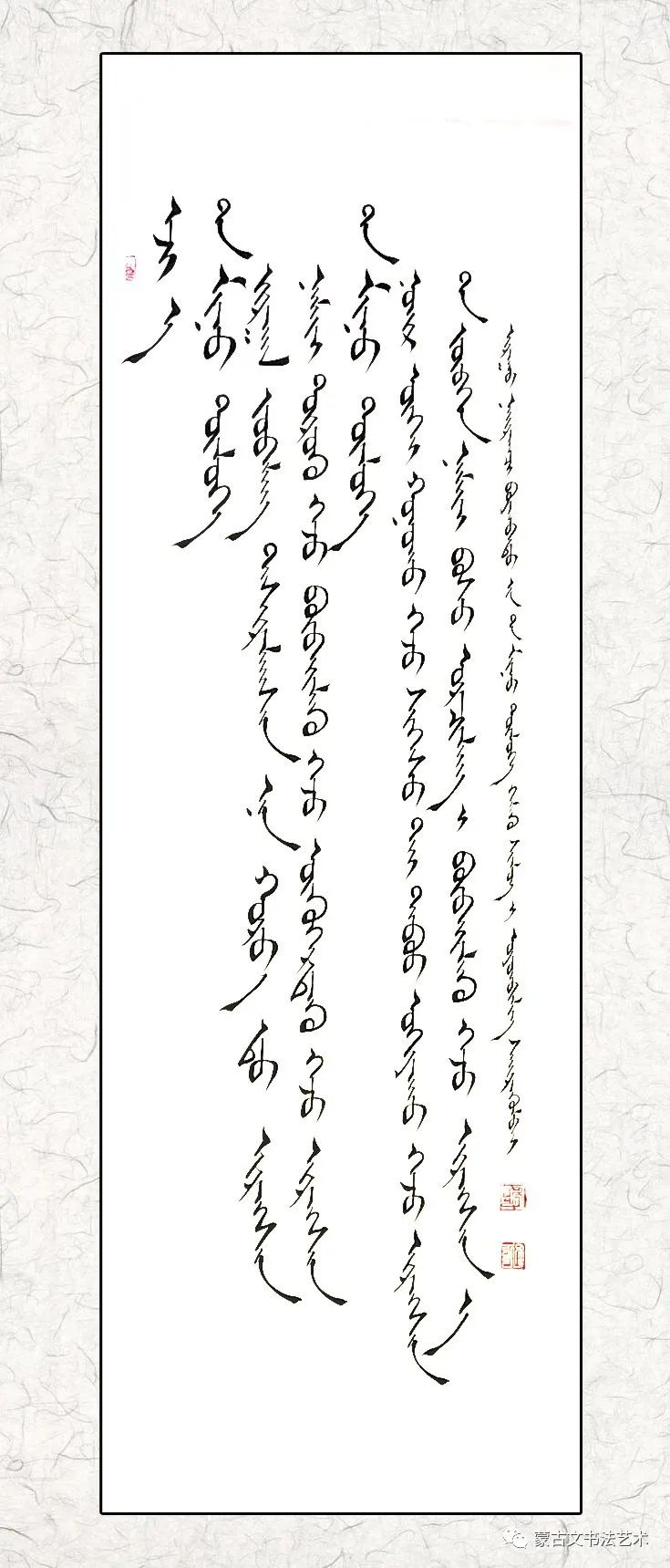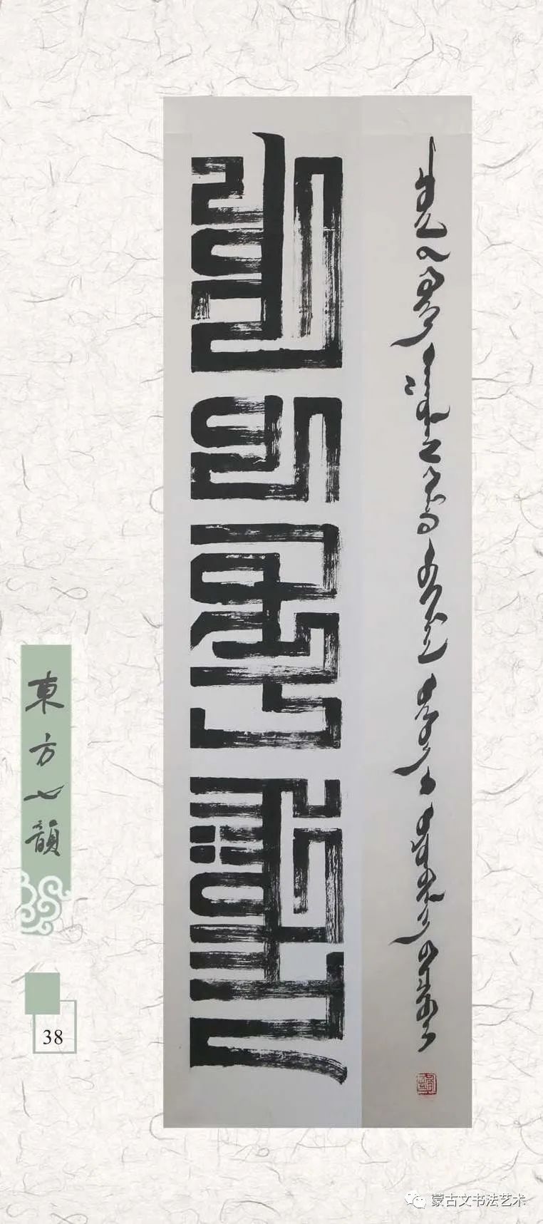 在这里需要说明,所谓《东方七韵》不是指作者七人,而是象征和隐喻他们辛勤学习和书写的传统蒙古文书体。蒙古文书法历史悠久、博大精深、千姿百态、意趣超远的艺术门类,具有独特的形态美和意蕴美,最鲜明地体现蒙古民族潇洒、灵动的语言文字魅力的文化艺术瑰宝。民族书法艺术后继有人,令人喜悦不止。祝愿七位在今后的书法艺术道路上取得更加优异的成绩,让梦想启程远航。优秀的书法家将会得到人们的喜爱和崇敬,而真正得到人们的喜爱和崇敬也是一种责任和担当。只有担当起这一重任,才能传承和创新发展蒙古文书法,使我们灿烂的民族文化艺术巍然屹立于世界民族艺术之