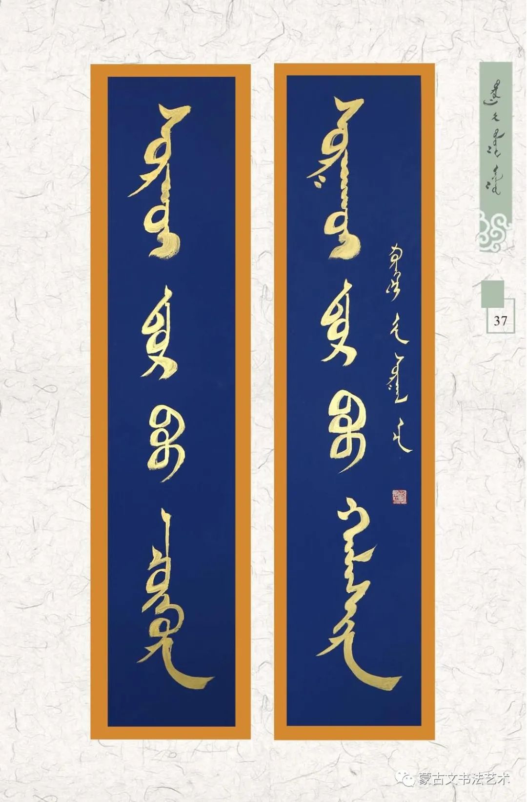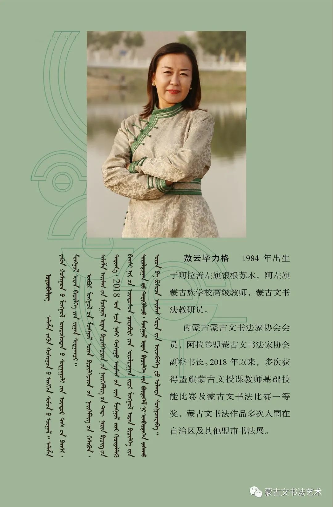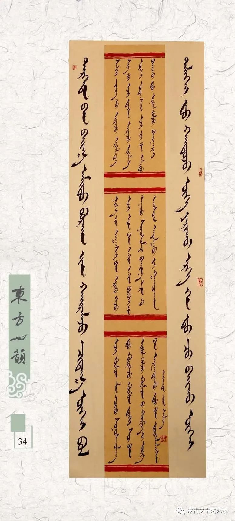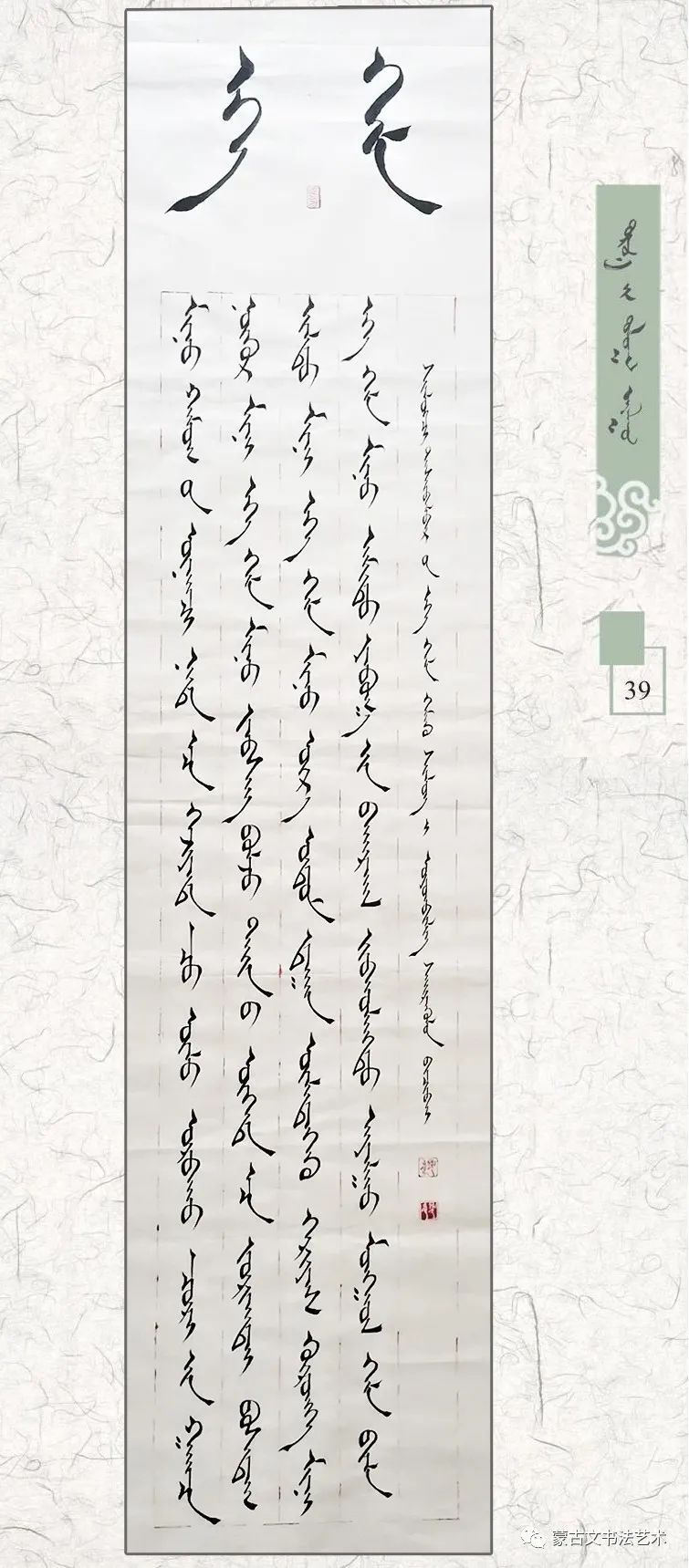 在这里需要说明,所谓《东方七韵》不是指作者七人,而是象征和隐喻他们辛勤学习和书写的传统蒙古文书体。蒙古文书法历史悠久、博大精深、千姿百态、意趣超远的艺术门类,具有独特的形态美和意蕴美,最鲜明地体现蒙古民族潇洒、灵动的语言文字魅力的文化艺术瑰宝。民族书法艺术后继有人,令人喜悦不止。祝愿七位在今后的书法艺术道路上取得更加优异的成绩,让梦想启程远航。优秀的书法家将会得到人们的喜爱和崇敬,而真正得到人们的喜爱和崇敬也是一种责任和担当。只有担当起这一重任,才能传承和创新发展蒙古文书法,使我们灿烂的民族文化艺术巍然屹立于世界民族艺术之