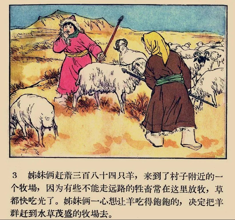 姊妹俩赶着三百八十四只羊,来到了村子附近的一个牧场,因为有些不能走远路的牲畜常在这里放牧,草都快吃光了。姊妹俩一心想让羊吃得饱饱的,决定把羊群赶到水草茂盛的牧场去。