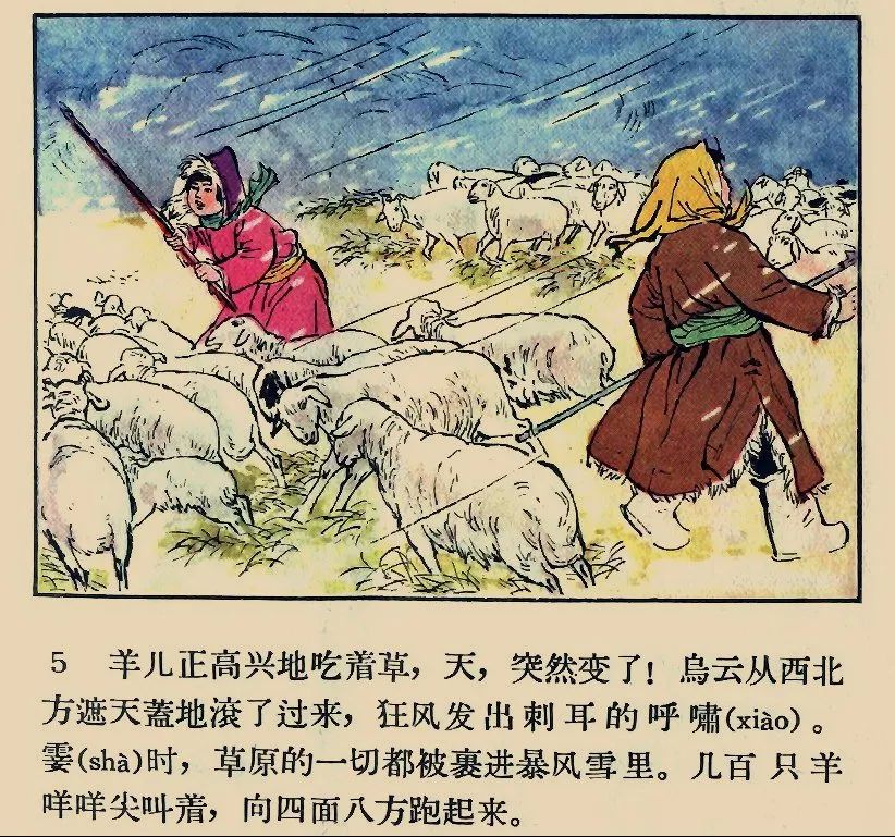 羊儿正高兴地吃着草,天,突然变了,乌云从西北方遮天盖地滚了过来,狂风发出刺耳的呼啸。霎时,草原的一切都被裹进暴风雪里。几百只羊咩咩尖叫着,向四面八方跑起来。