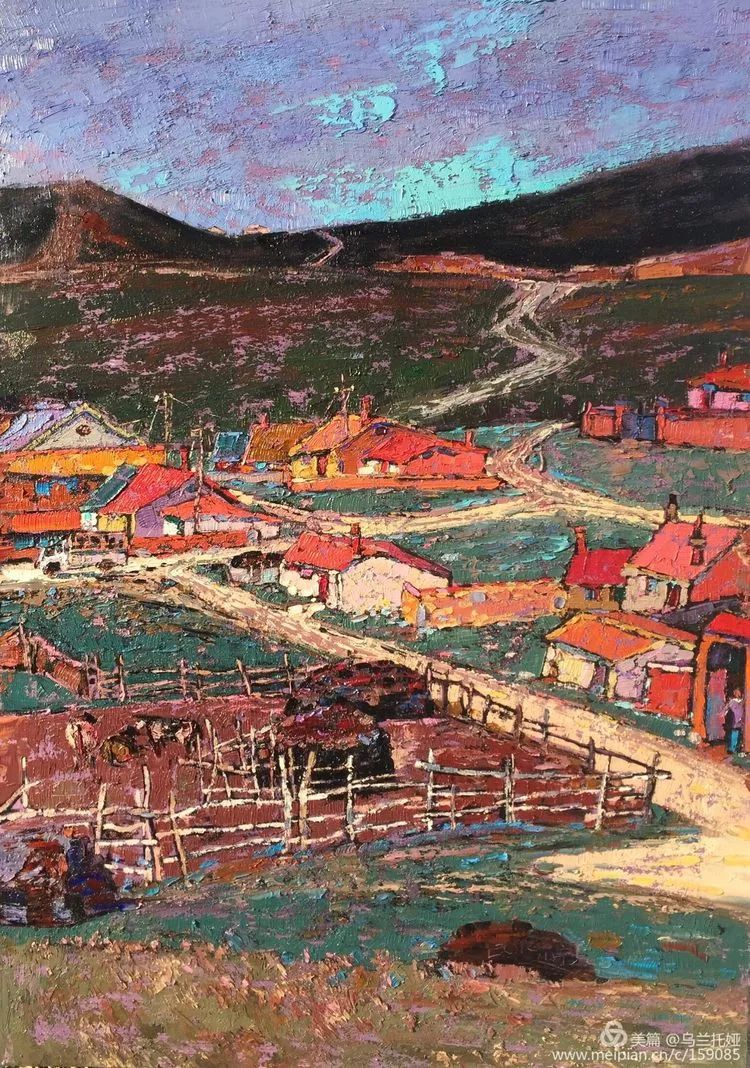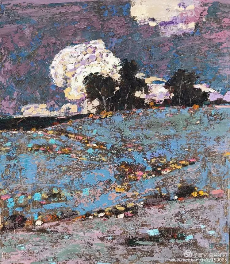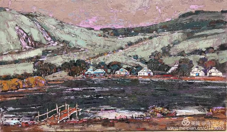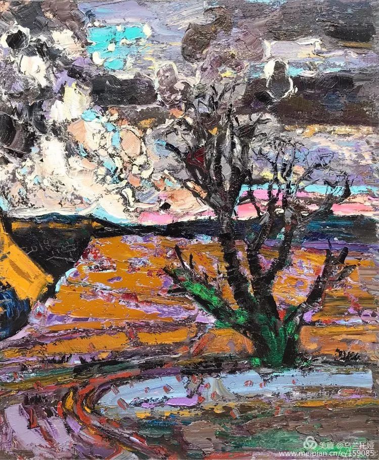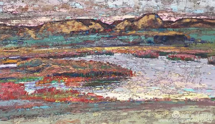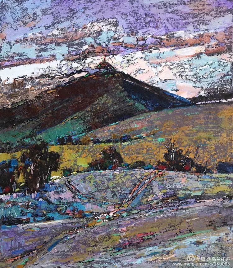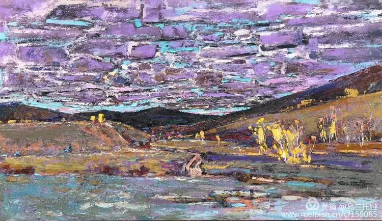 《哈根淖尔》90x130cm 他以粗狂而细腻的笔触、丰富而祥和的色彩,表达着对大自然的深切关爱。 旷达而深厚的蒙古高原,绵延起伏而亘古的大漠,风沙漫走而荒凉的草原。春夏秋冬四季更替,他的画总是那样宁静、孤寂、深邃、辽远,给人一种神圣而庄严的感觉。