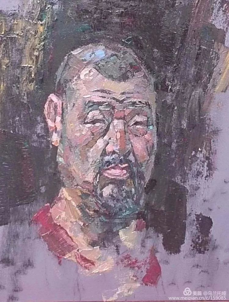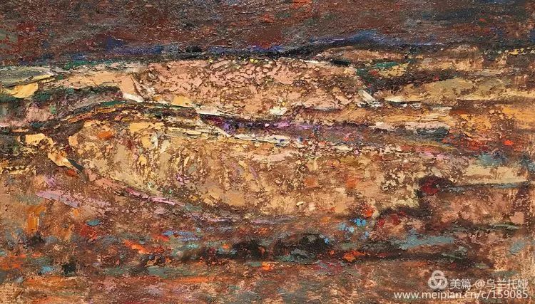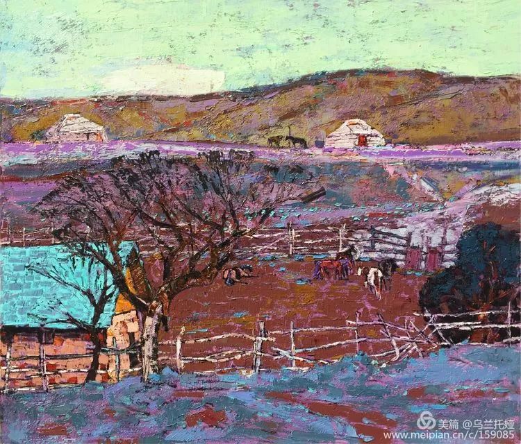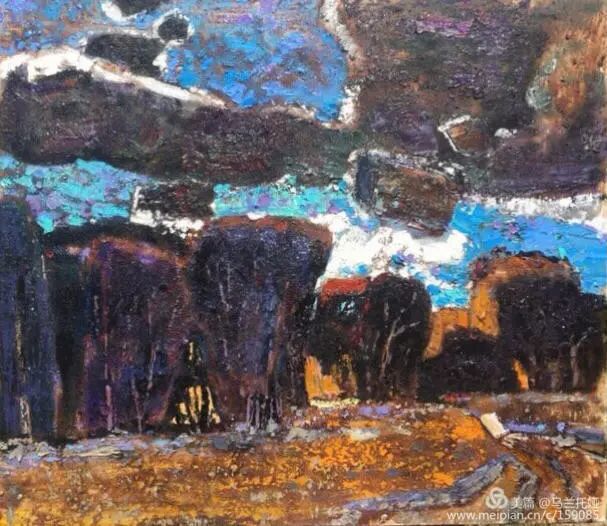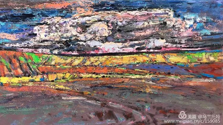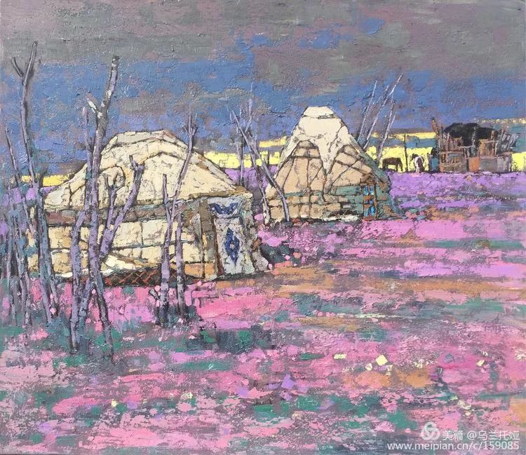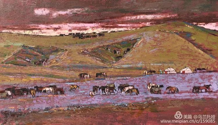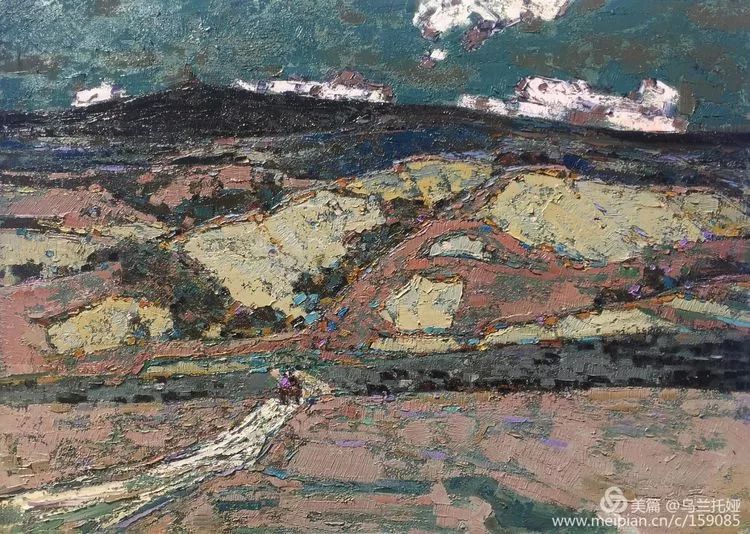 《哈根淖尔》90x130cm 他以粗狂而细腻的笔触、丰富而祥和的色彩,表达着对大自然的深切关爱。 旷达而深厚的蒙古高原,绵延起伏而亘古的大漠,风沙漫走而荒凉的草原。春夏秋冬四季更替,他的画总是那样宁静、孤寂、深邃、辽远,给人一种神圣而庄严的感觉。