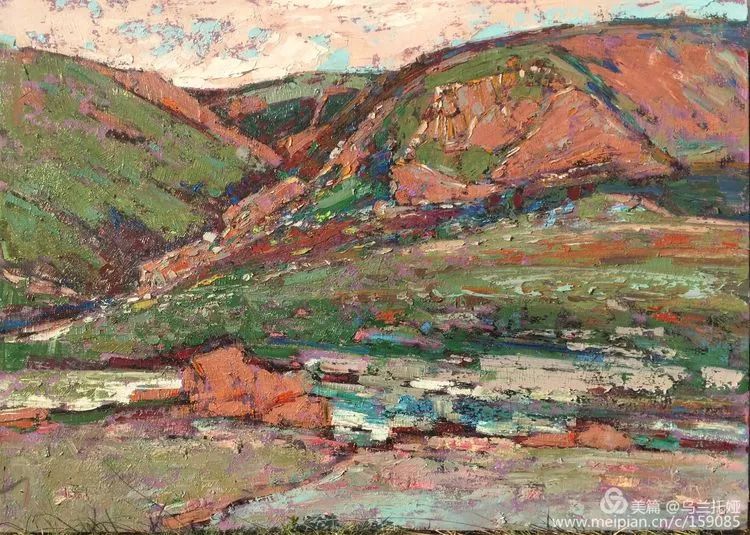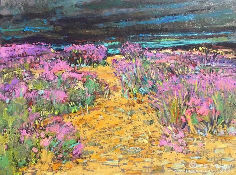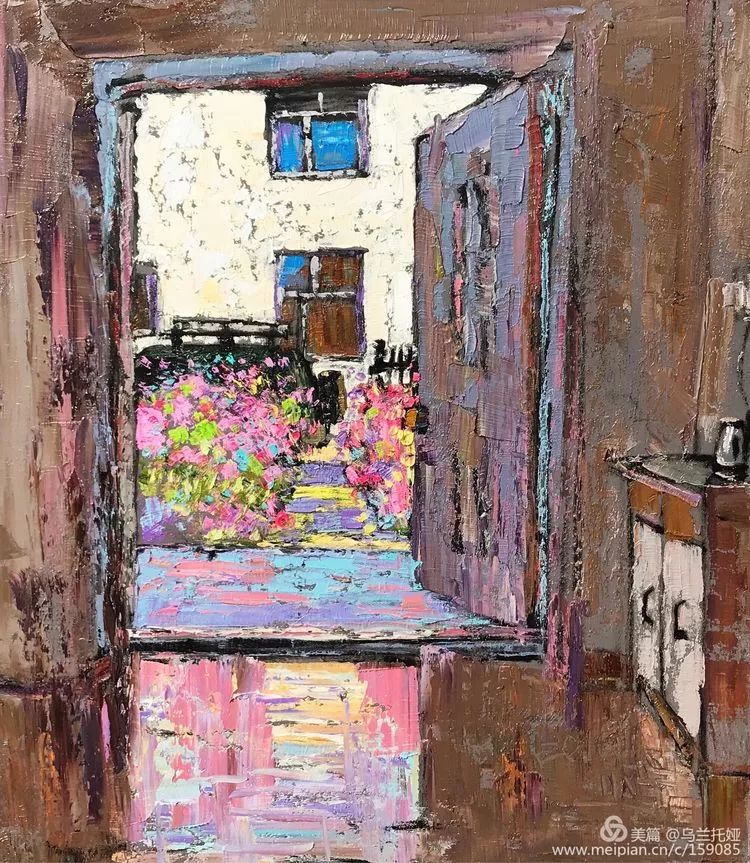 《秘境》80x70cm 他喜欢在阳光下写生,捕捉和描绘自然在阳光照耀下色彩的微妙效果。他喜欢在自然中写生,从清新的风光中揭示色彩晕染流动的奥秘,感悟色彩的争妍与和谐。阳光的欢愉与变化、自然的节奏与坦诚、人生的明朗与清馨,温润着他的性情,升华着他的生活态度,完善着他对艺术的理解。