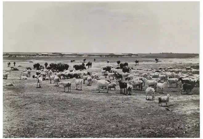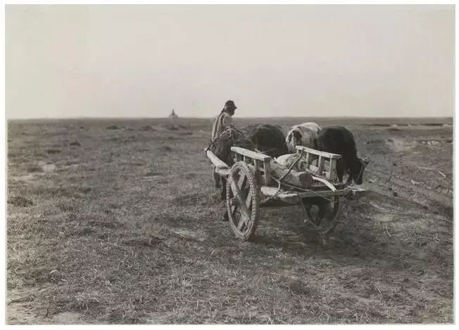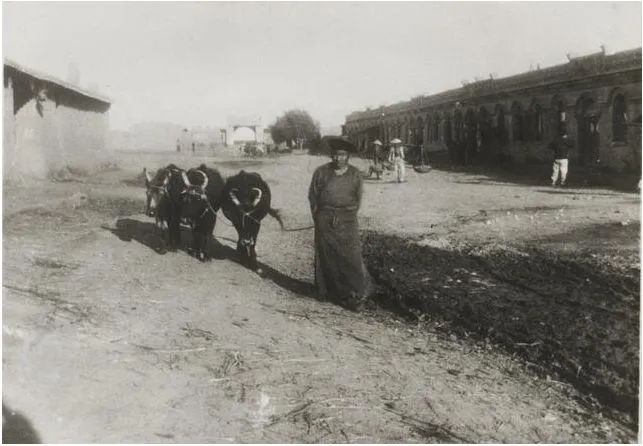 当时属于热河省的开鲁县大街,远处的城门清晰可见,空旷的大街上,行人稀少,正中是一位蒙古族老人牵着三头牛走来。