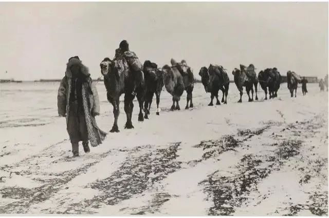 白音太来的郊外,草原上白雪皑皑,暮色时分,一个骆驼队慢行而来,前方一人身穿皮袄,牵着头驼。