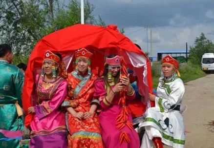 在姑娘出嫁的前两天,要请莫昆族内的男女长者们来,共同商定送亲的宾相、车夫以及人数、车马数。送亲的男宾叫“华达”,三至五人;女宾叫“霍都古”,二至三人;送亲车三、四辆,骑马的二至三人,富裕户还有几辆嫁妆车,总计不过十五个人左右。路途较远的,均套双马大轮车,队伍壮观有气派。