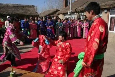 他们的问答,举例说是这样的:把门人首先发问,你们从何处来,向何处去,在这门前停车是为了何事,你们到底想要做什么等等。对方故意将话题岔开,不能作正面的直接的回答,而是巧妙地绕圈子。绕圈子回答的就是这位陪礼人。他可以说许多假话,海阔天空扯上一顿,口气里还要带许多恳求之意。比如陪礼人说,我们是做买卖的,从远道而来,走了一天,天色将晚,一没碰上旅店,二没亲朋故友,已经人饥马乏,想到你们这里借宿一宵,歇息一夜,明日早行,请予方便之类的话作答。这时年轻人故意刁难他们说:我们不认、不熟,不留生人借宿;再说我们家里老少几辈,人口很多,很不方便,不能留你们住宿,请不要白磨牙,枉费唇舌,劝你们在天黑之前,赶到别的人家借宿去吧。这时要用软中硬、硬中软的话作答:我们好不容易来到了你们屯里,已经借宿几家,可是都不开情面,不准住下,难道你们这样不理解外出赶路人的苦处?人出门在外,总不能背着房子走吧?人出门在外,都会遇到困难的,所以再三请求你们开恩,行个方便,如果炕上没地方住,在屋地也行,总比在野外露宿好些吧,望你们照顾一下,让我们歇息一宵。这样,经过一番理论,互作答辩,在老人的授意下,方能解除刁难,打开大门,准许礼车进院。于是女方家热情地接待新郎和陪礼人。