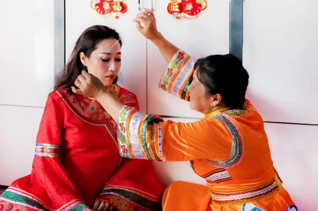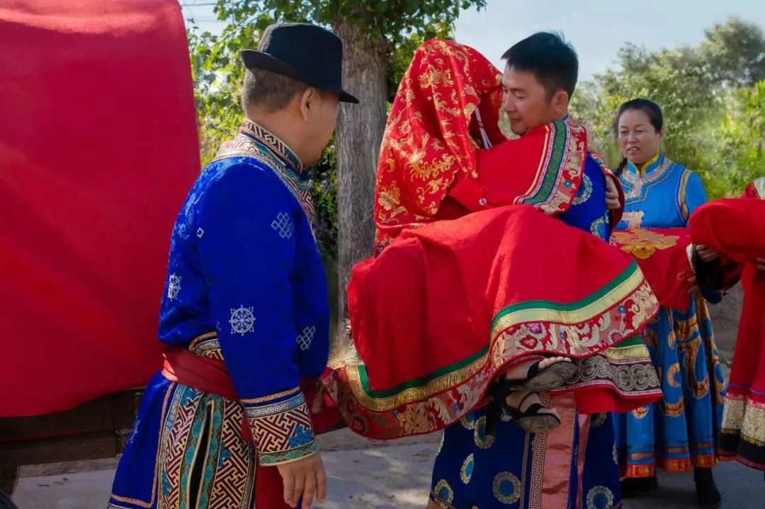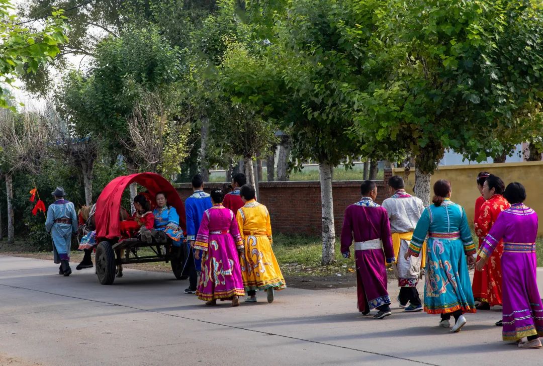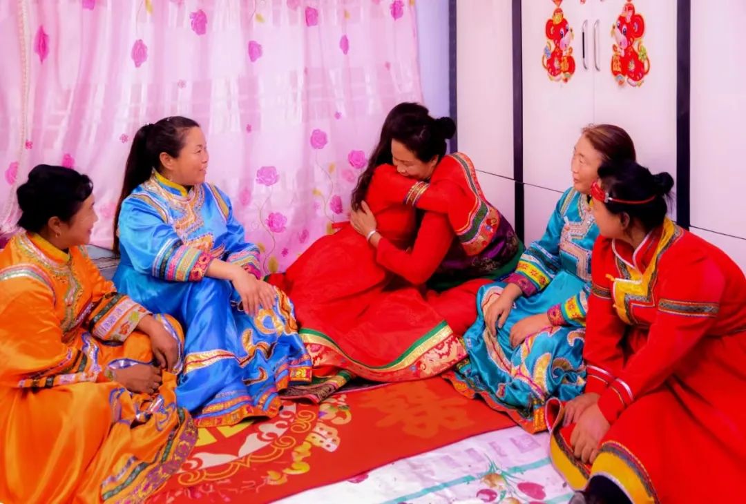 次日,鸡鸣之时,新娘就被姑姑喊起绞脸修鬓。看到妆后的宝贝女儿更加千娇百媚,爸爸感叹的说到“女大不中留呀,小鹰雏长大了,该独自飞翔了。”吉时已到,妈妈抹着喜泪,让丈夫把女儿背上了红篷喜车。娘家嫂子给羞涩而兴奋的新娘披上了红盖头,大家是一路欢歌笑语,连鸟儿也被吸引围绕在新娘的喜车旁,吱吱喳喳地欢唱。当送亲队伍快要到目的地时却绕到村的西头,原来达斡尔族有“喜车不管从那个方向来,当快要到达新郎家时也要调转车头迎着太阳走,意思是前途光明。即使是阴天或路远日落才到达,也要在新郎家大门的西侧挂上一面“象征着太阳”的镜子。![]()
