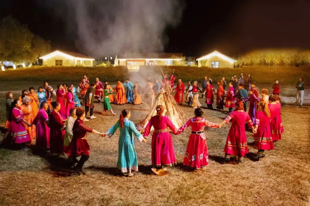 当夜幕降临时,娘家嫂子开始在新房里为俩位新人铺被子、挂幔帐和房前婚教。〔达族在新娘出嫁时,有娘家嫂子陪同其住婆家三天的婚俗,为的是房前婚教和传授忠孝礼仪。〕而隆重的婚礼到此并未真正结束,婚夜狂欢才刚刚开始。村民们在村中的休闲广场又点起篝火,欢快愉悦的跳起了罕伯舞,庆祝俩位新人的喜结良缘。![]()