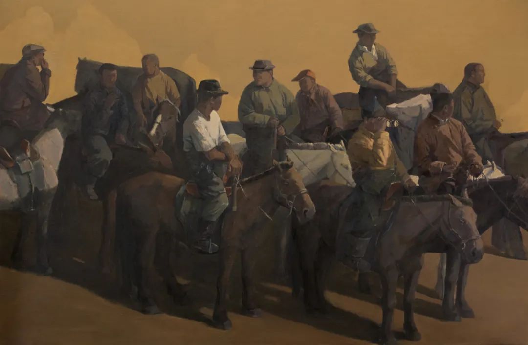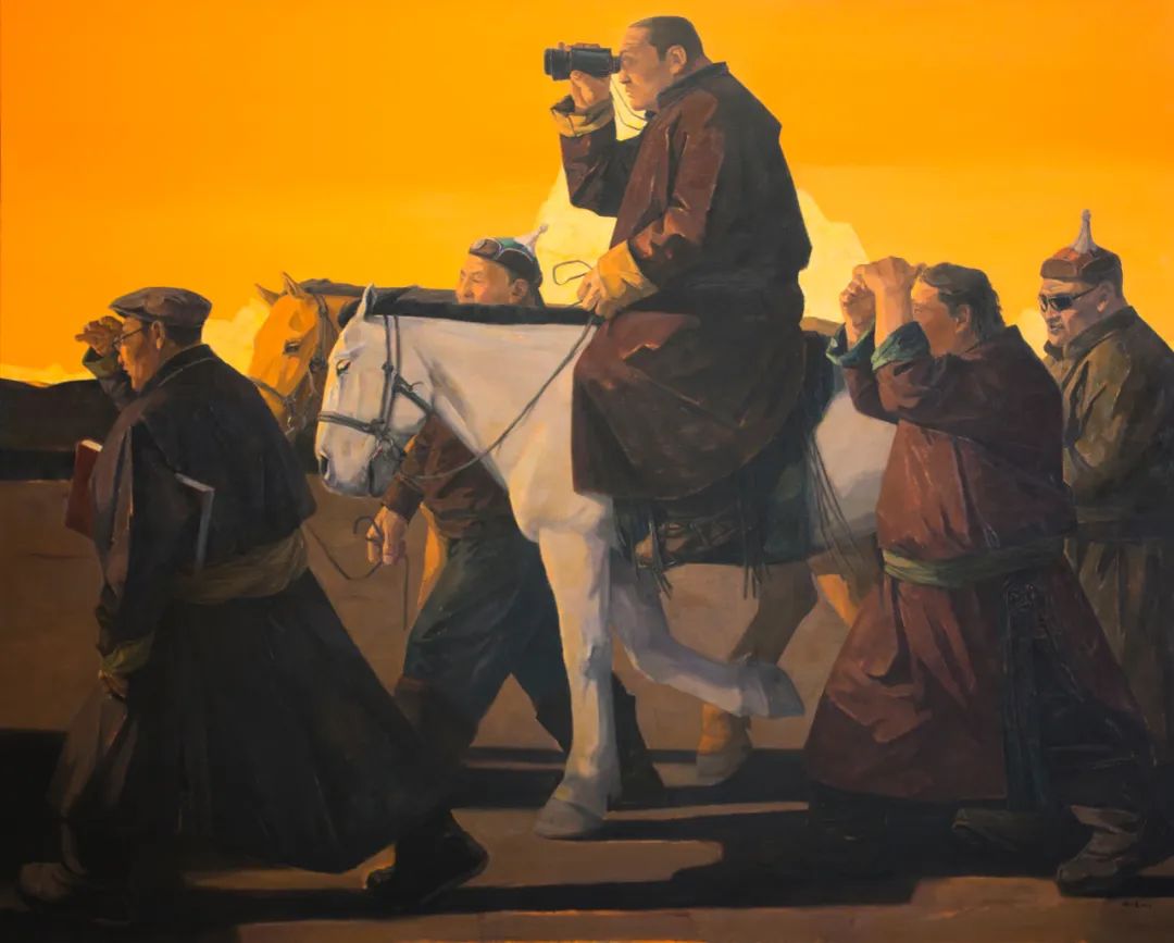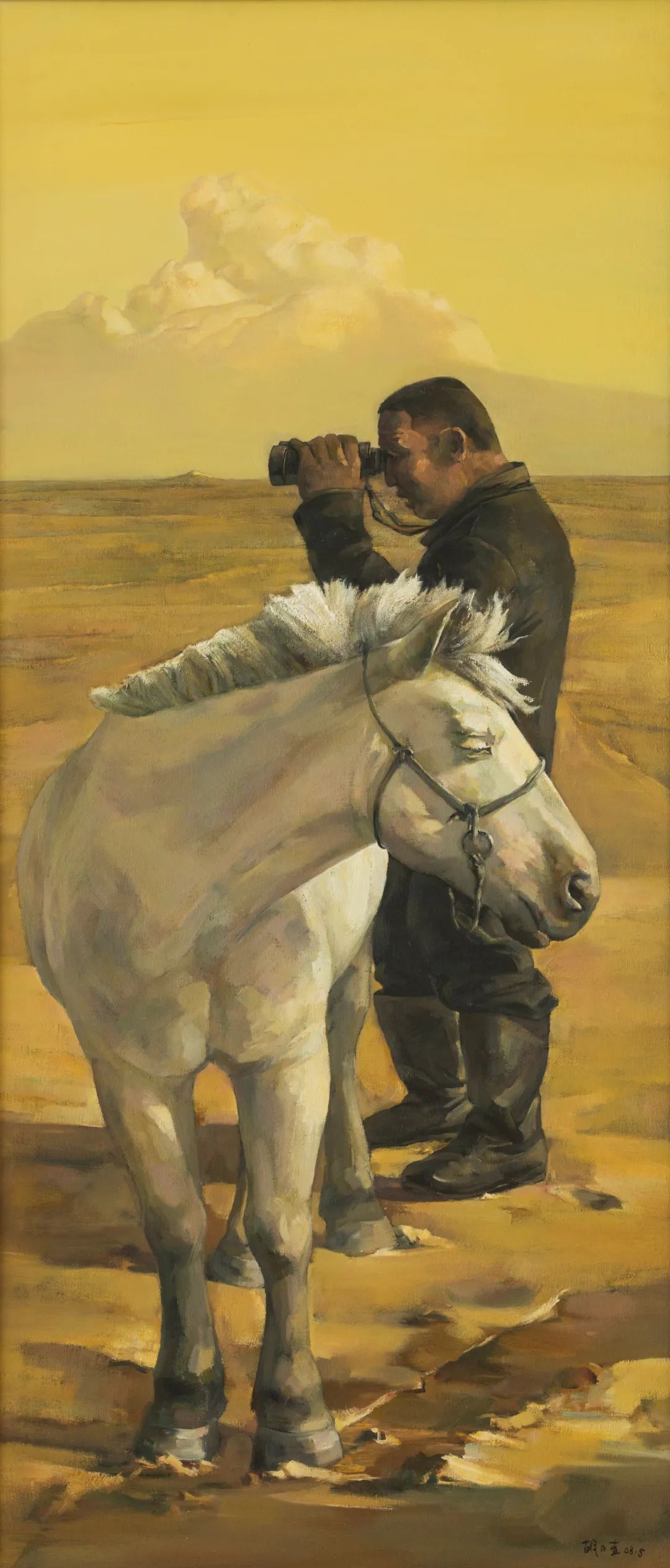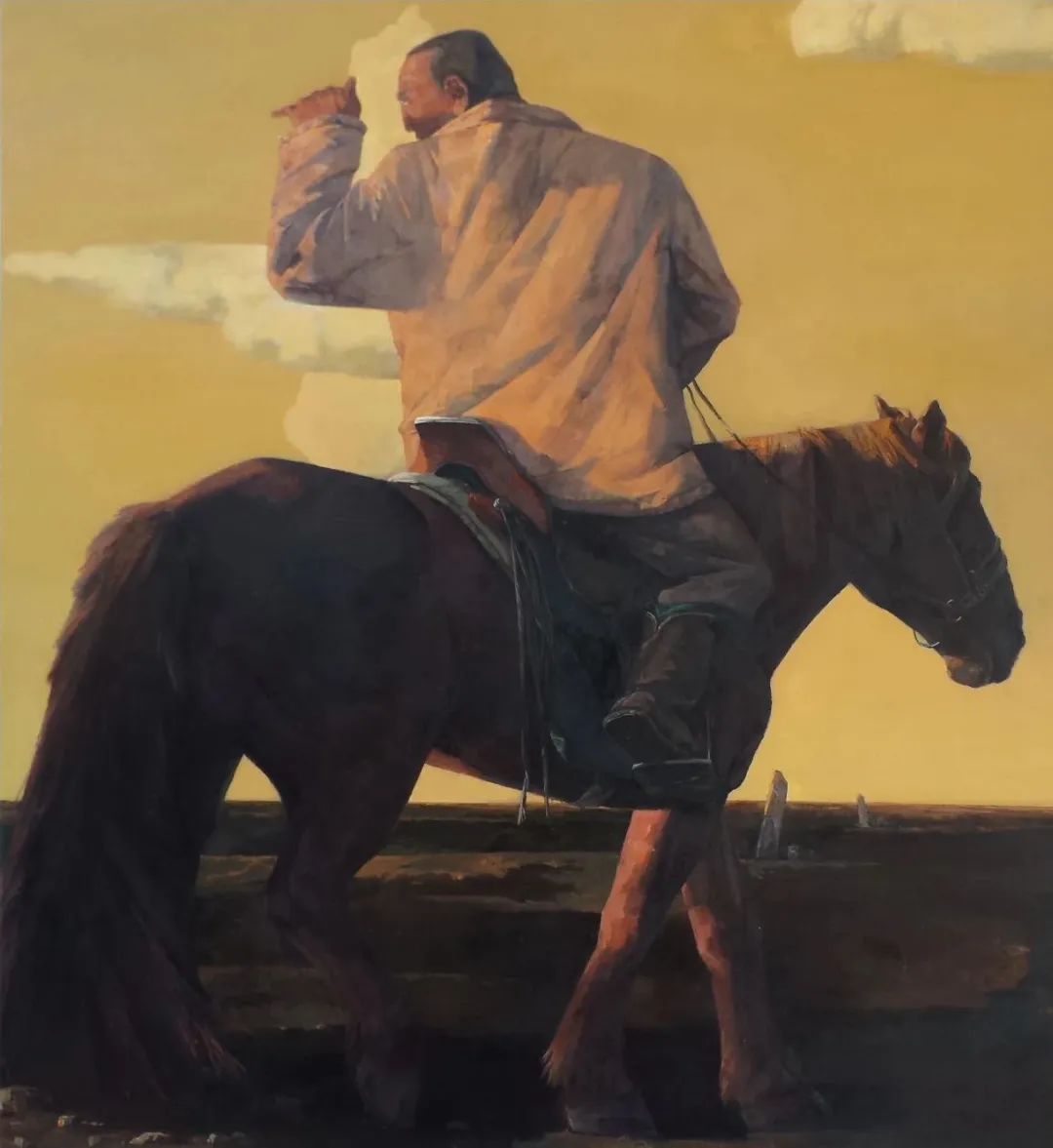 力求透过表象的风情、风俗努力进入蒙古族精神内核,是我在艺术创作中一以贯之的表述原则。当然,这样的追求在艺术中是要不断坚持和思考的,是要在长期的艺术实践中不断探究提炼的。在近年来的创作中,我力图通过提升艺术语言的表达来实现自己在这方面的思考,例如在《无尽的黄昏》、《黄昏的云》、《诗与远方》等作品中,经过画面构成的处理和在色彩、造型方面的概括提炼,描绘孤独中远行的形象。