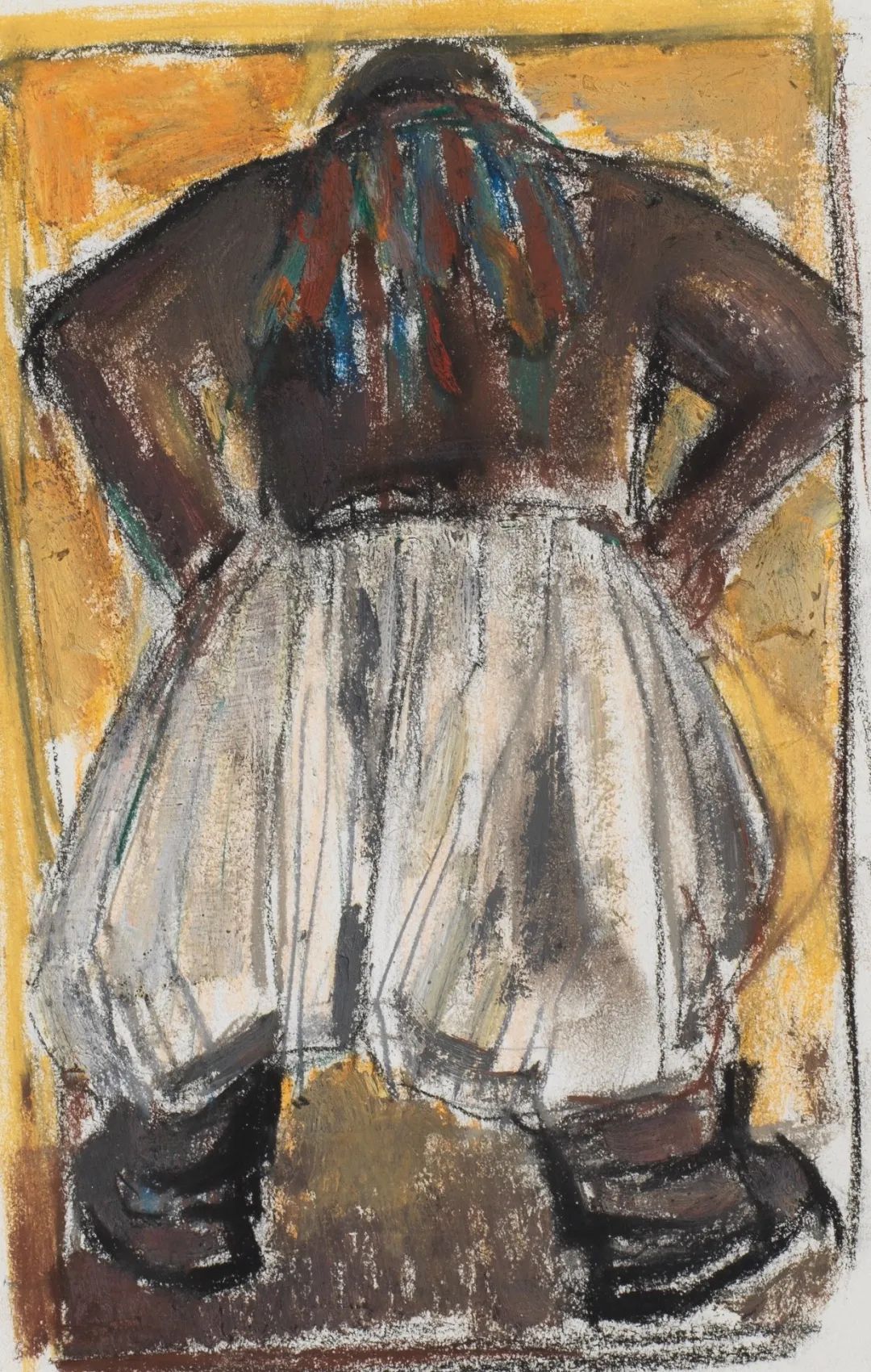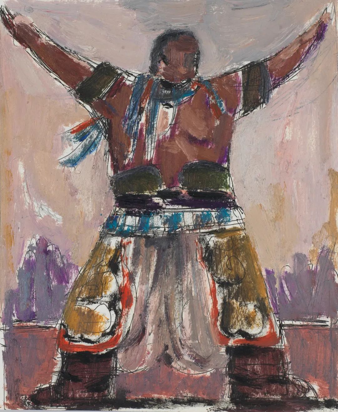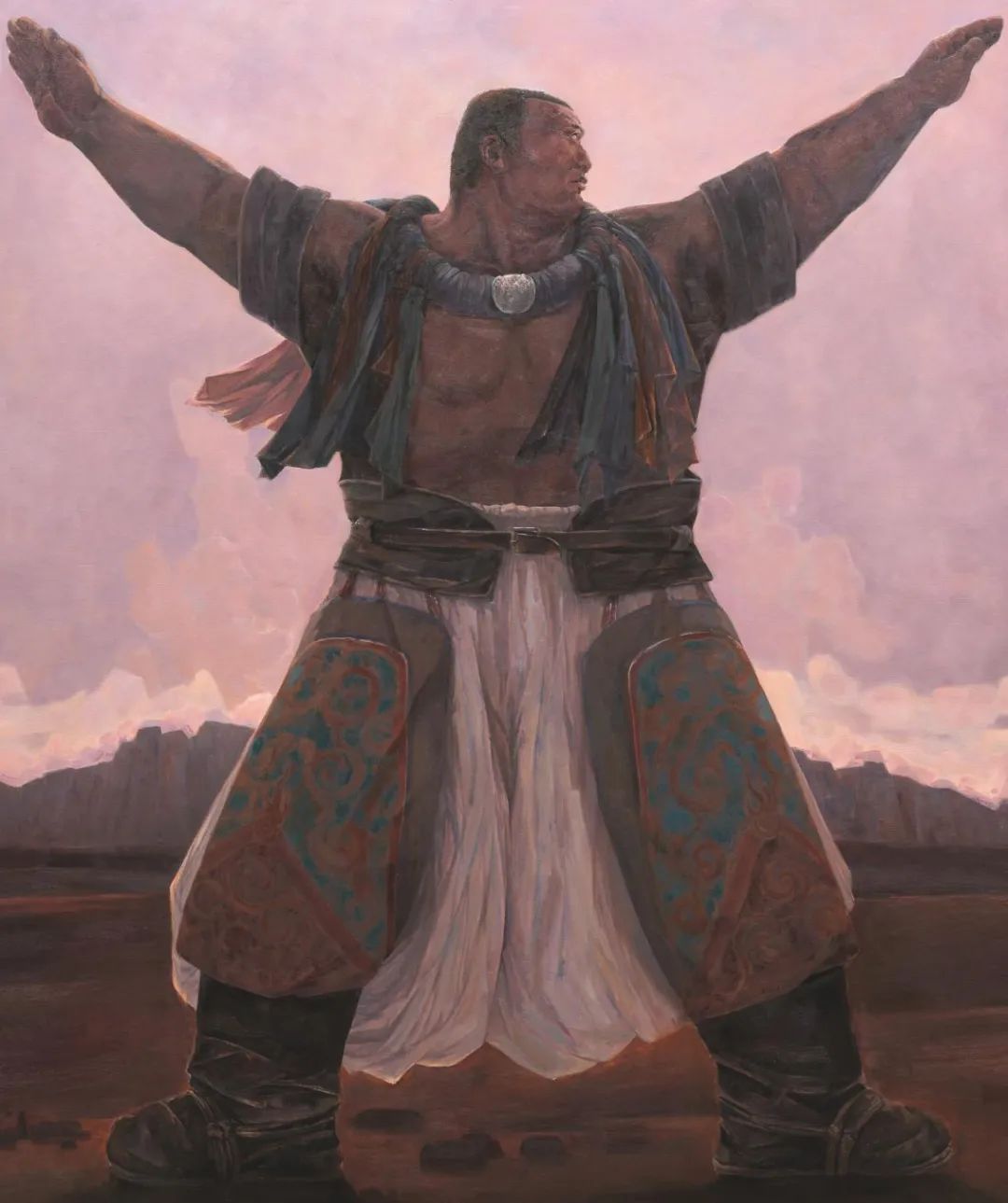 力求透过表象的风情、风俗努力进入蒙古族精神内核,是我在艺术创作中一以贯之的表述原则。当然,这样的追求在艺术中是要不断坚持和思考的,是要在长期的艺术实践中不断探究提炼的。在近年来的创作中,我力图通过提升艺术语言的表达来实现自己在这方面的思考,例如在《无尽的黄昏》、《黄昏的云》、《诗与远方》等作品中,经过画面构成的处理和在色彩、造型方面的概括提炼,描绘孤独中远行的形象。