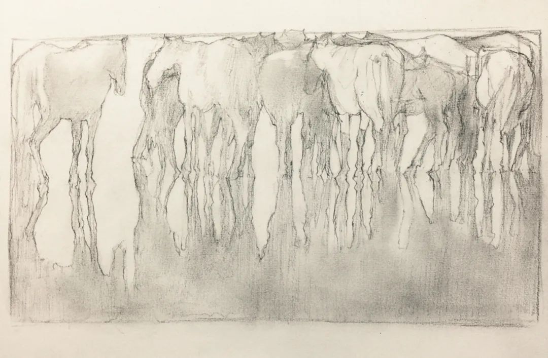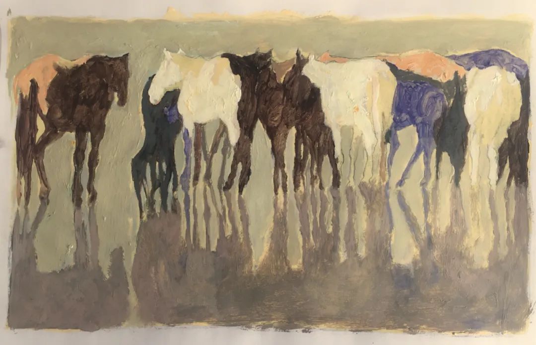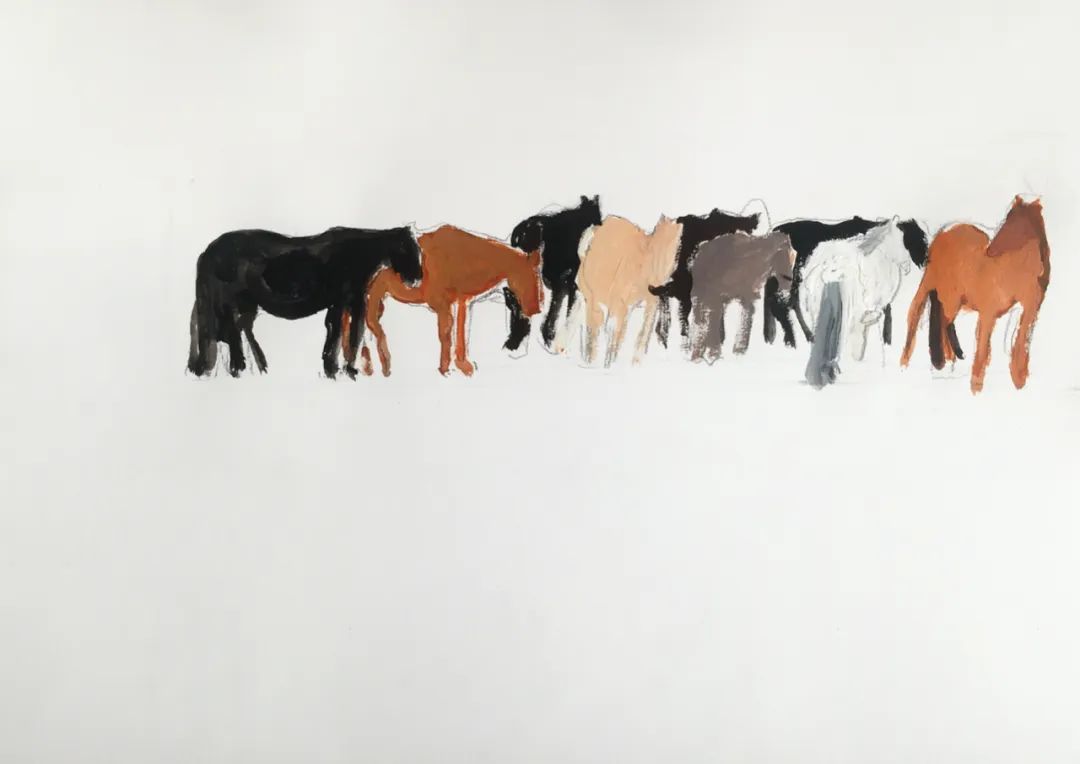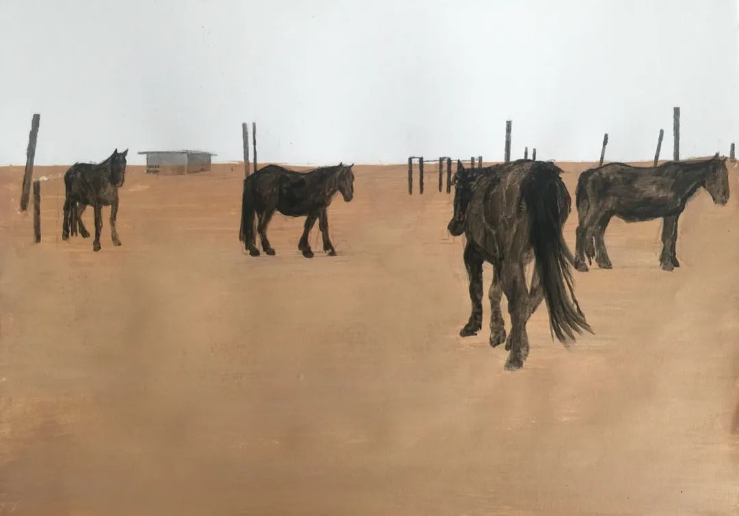 草原的变化对这一母题的艺术创作的影响是显而易见的,许多艺术家在绘画创作中体现了一种倾向,草原似乎成为一种个人传达感受和进行艺术追求的“符号”。毡房、牧人、蒙古马这些代表草原的事物在当下的艺术作品中展露出的不再是浓郁的草原风情和风俗,而更多的是艺术家对草原生活和草原变迁,乃至所处社会环境的个体感受和理解,草原,越来越成为艺术表达所借助的文化符号。同样,在我的一系列作品中,有意展现了这样一种思考,试图通过《困马系列》和其后的作品,对这样的现实进行艺术上的的探讨和追问。