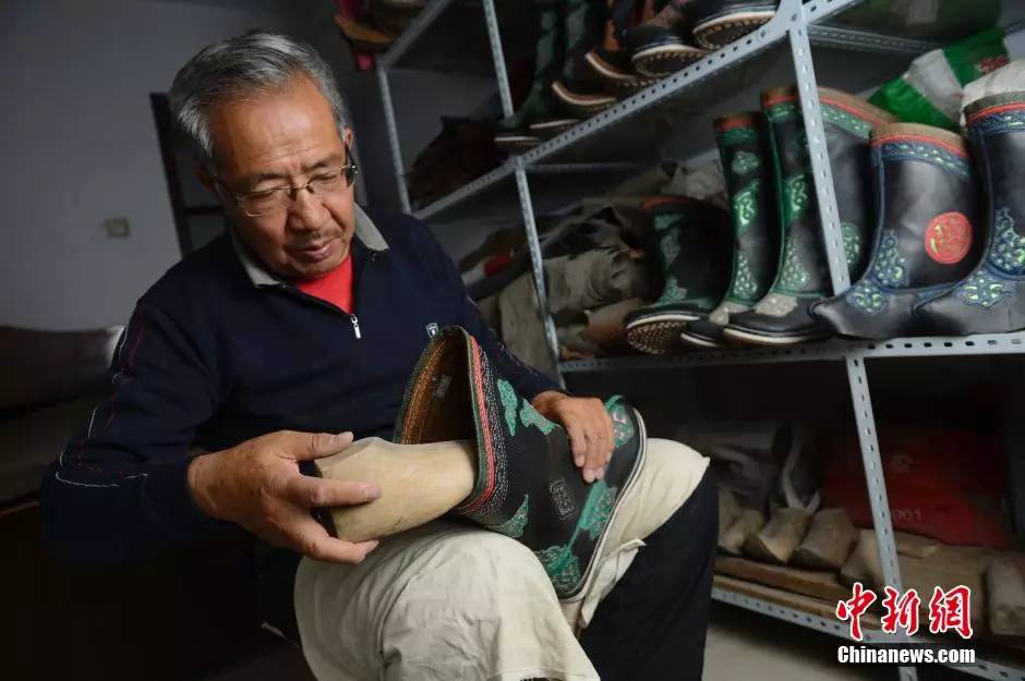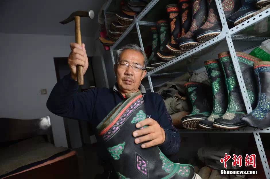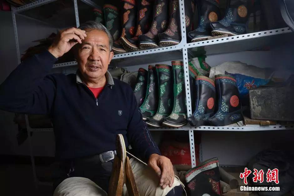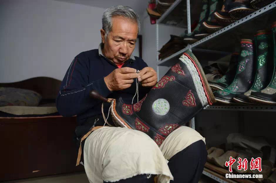 蒙古靴是颇具特色的蒙古族服饰的重要组成部件之一,以制靴材料来分,蒙古靴有毡靴、皮靴和布靴之别。传统的蒙古皮靴要采用一些特殊的材料,经50多道工序才能制作完成。目前,在呼和浩特市场上可见的绝大多数蒙古皮靴,所采用的材料皆不佳,工艺也与传统的制作工艺存在很大差距,66岁的吴润达师傅,在时隔42年后,于2006年5月又重操旧业,再现了这种手艺。