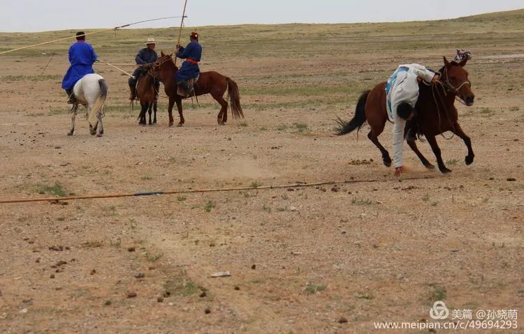 运动开始时让烈马疾奔,众骑手纵马飞驰追赶,至适当距离时即迅速套马,以先套住马头、拉住烈马者为胜。