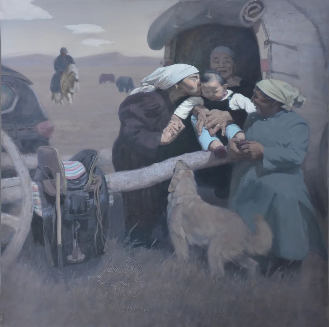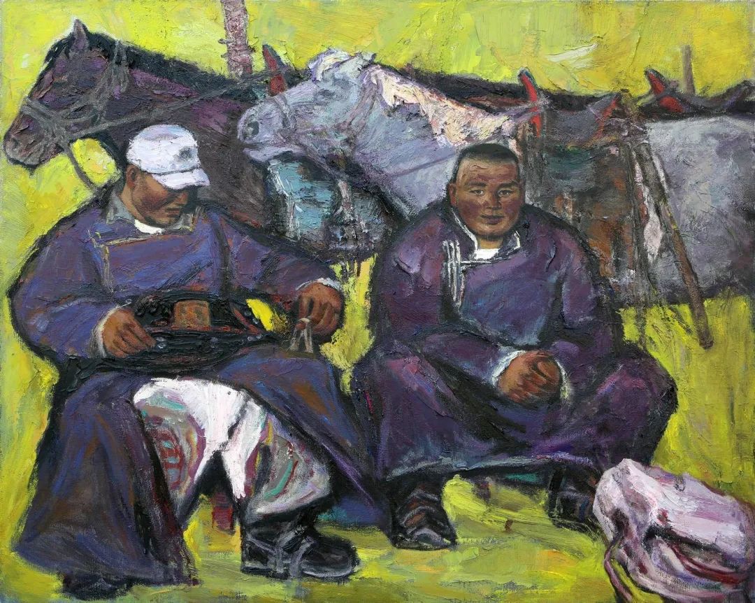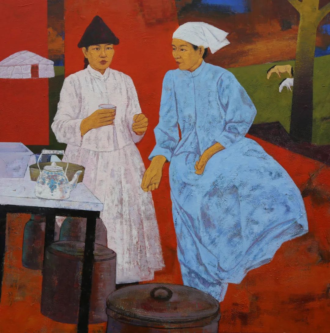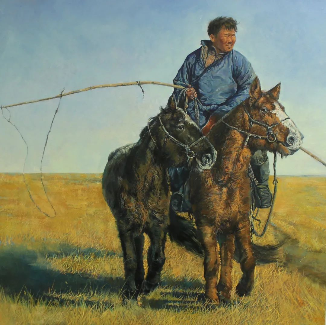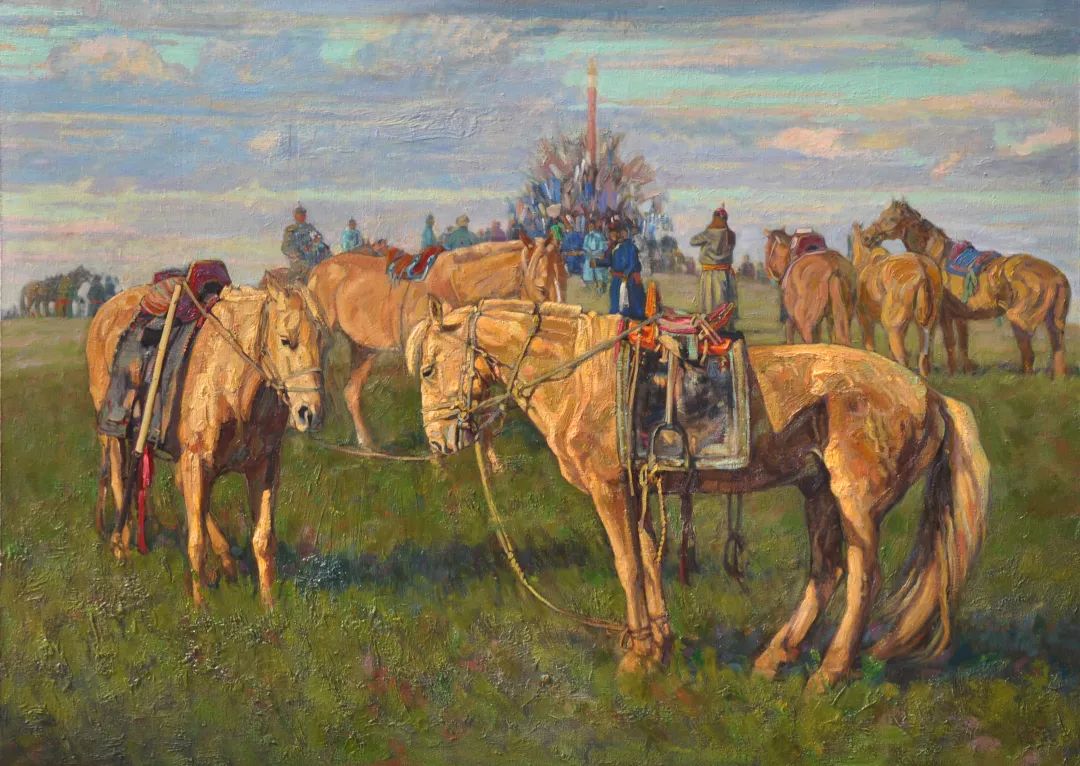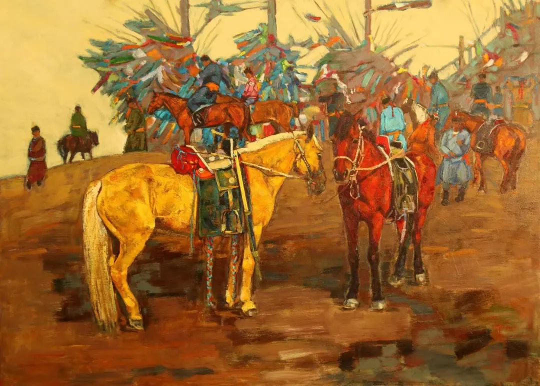 内蒙古自治区地处边疆少数民族地区,深受民族、地域文化的滋养。早在1954年第一所美术高等美术教育院系建设之初,就有王之英、邱石冥等多名当时国内知名教授在此执教,随后又有妥木斯、朝戈、苏新平等一批著名美术院校的优秀毕业生陆续回到内蒙工作,使得内蒙高等美术教育具有较高的起点。自此之后又相继成立了许多所同类院校,形成了相对繁荣的局面。培养了一批批优秀的高等艺术教育人才,这次线上展览中我们所看到的这些艺术家都是工作在内蒙古自治区高校教学前沿的教师,他们为近年以来的草原题材油画创作的现代性探索做出了巨大的贡献。
