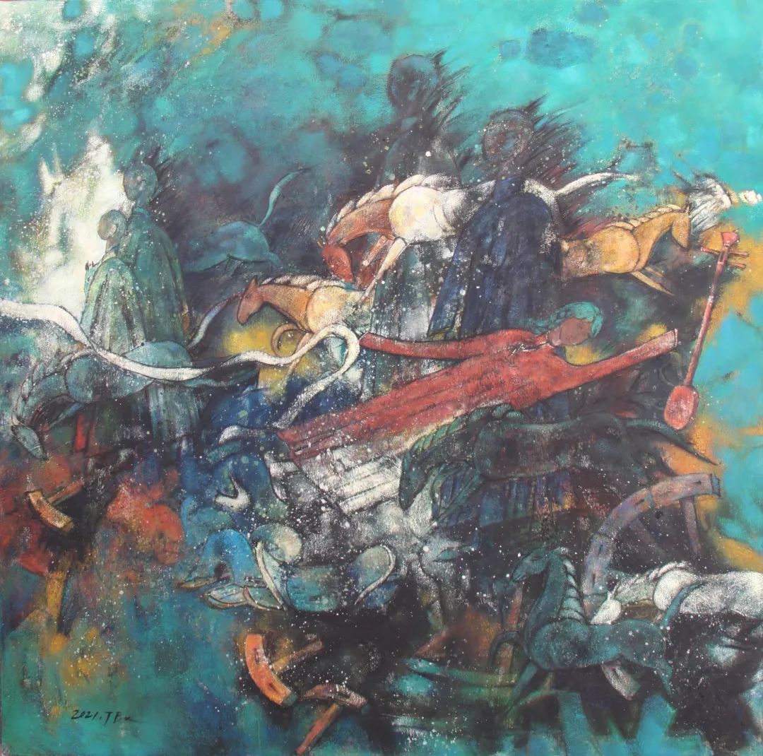 这些作品既在草原题材美术创作上第一次揭示了以往大众很少关注到的游牧民族在漫长岁月里必须经受的某种真实心理,又在具象表现为基础的创作上通过隐喻、变形、超现实等表达手法,完成了一幅幅精神传递并且个性鲜明的“游牧式”视觉图式创造。