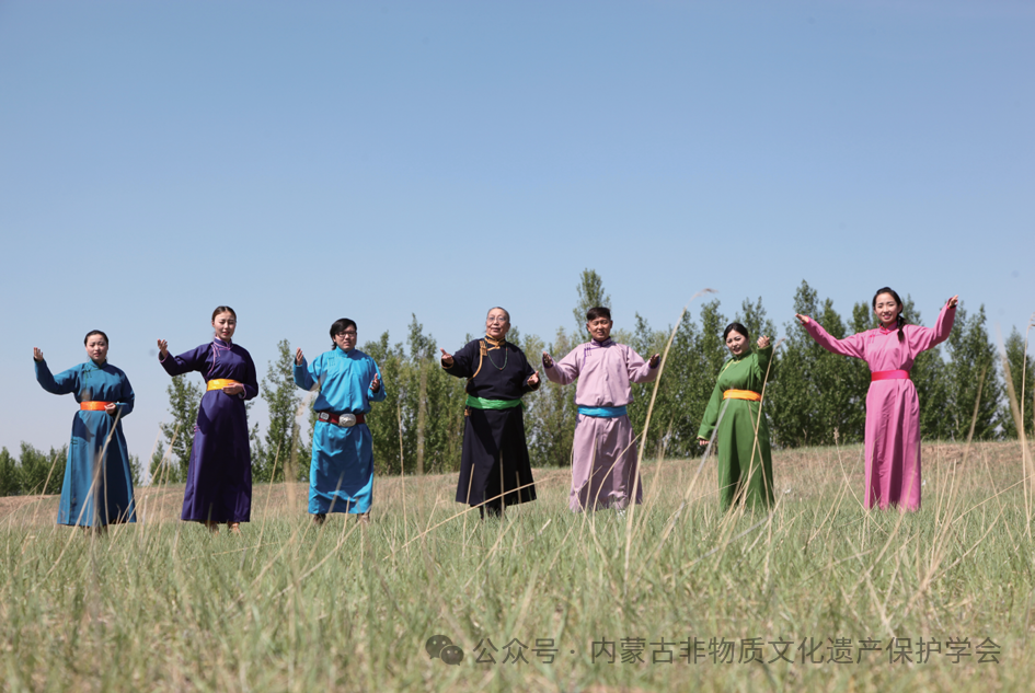 阿拉善民歌传承班学生及其导师鲁·巴德玛在草原上