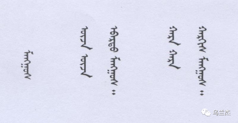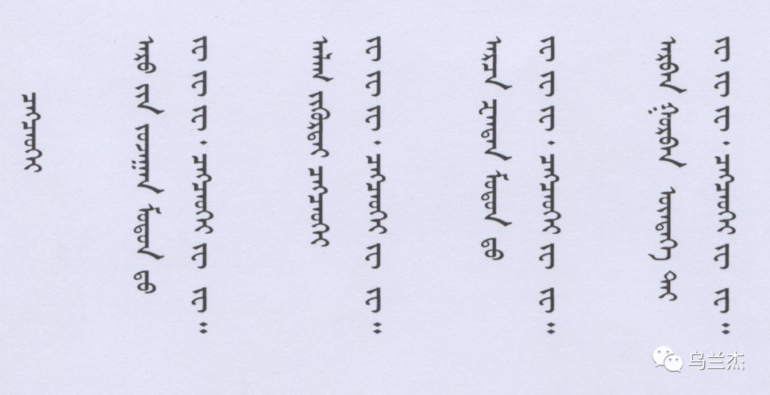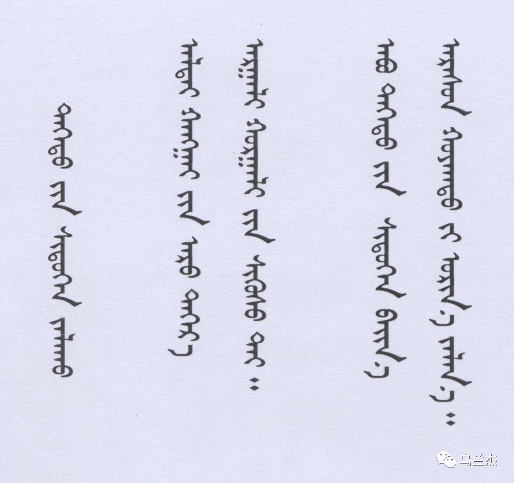 歌词的格律方面,蒙古语不同于汉语,诗词格律讲究音步和轻重。类似西洋诗歌,区分“抑扬格”和“扬抑格”。蒙古语言存在所谓“元音谐律”,重音在前,故诗词中多运用“扬抑格”,很少使用“抑扬格”。本文所讨论的是歌词问题,为了准确表达句法结构,翻译时采取直译的办法。因此,所引用谱例的歌词,与以往发表过的同一资料有所差别,但基本含义是相同的。另外,蒙文是拼音文字,词根通过变格产生不同含义,代表变格的字母并无独立含义,而是附属于词根。因此,字面上是五个或六个字母,但仍然属于四言体,特此说明,不一一赘述。