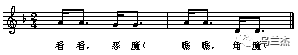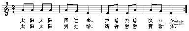 《赶路》的歌词结构采取叠唱手法,两段歌词的格式完全相同,不同韵步上重复相同的内容。有意思的是,蒙古族某些古老的儿歌中,竟然也存在着三言体歌词结构。例如,科尔沁地区广泛流行着一首儿歌,歌名叫做《太阳,太阳》,也是典型的例子。
