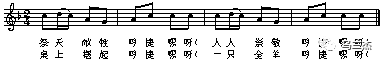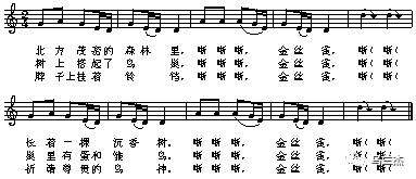 三言体的萨满教神曲歌词中,同样存在着延伸发展的复杂形态。例如,《金丝雀》是一首萨满教神曲,内容是呼唤图腾金丝雀,歌词是典型的三言体结构。该曲共5小节,上句2小节,为三言体歌词,下句为3小节,全部都是衬词,长度居然超过了第一句。第二句的最后一小节“哳哳”,则是模仿鸟叫的声音,清楚地表明了萨满教图腾歌曲的特点。