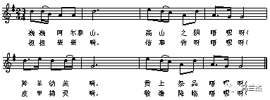 四言体歌词在汉族歌曲中同样存在,且历史十分悠久。两千多年前的《诗经》,便是典型的四言体。说明蒙古族和汉族在音乐思维方面存在着共同性。蒙古族古典歌曲时期还有赞祝词体裁,歌词为长短句结构;英雄史诗体裁,歌词为自由体结构。因篇幅关系,不在这里一一论述。
