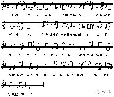 蒙古族科尔沁短调民歌《博如莱昂嘎》,是一首婚礼歌曲,其歌词就是六言体结构。但同五言体歌词结构一样,六言体歌词结构也较为罕见,即便偶尔出现,也是带有依附性和过渡性。