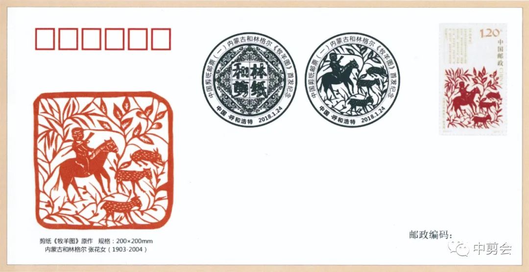 ▲ 张花女的剪纸作品《牧羊》入选国家邮政总局发行的《中国特种邮票(一)》。此套邮票是新中国成立以来首次系统出版发行的剪纸特种邮票。