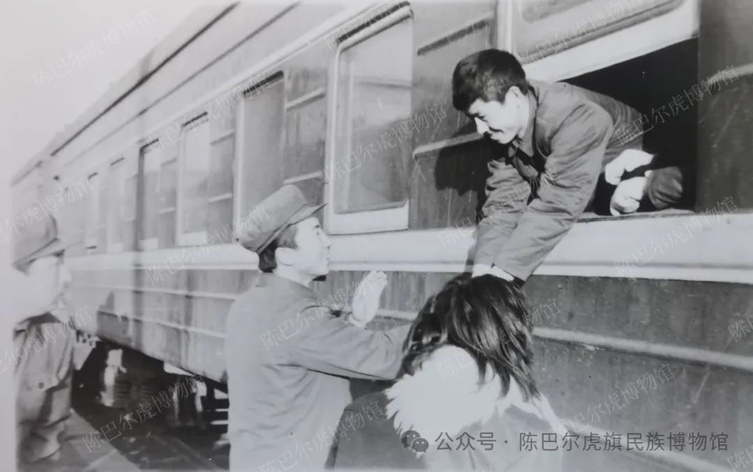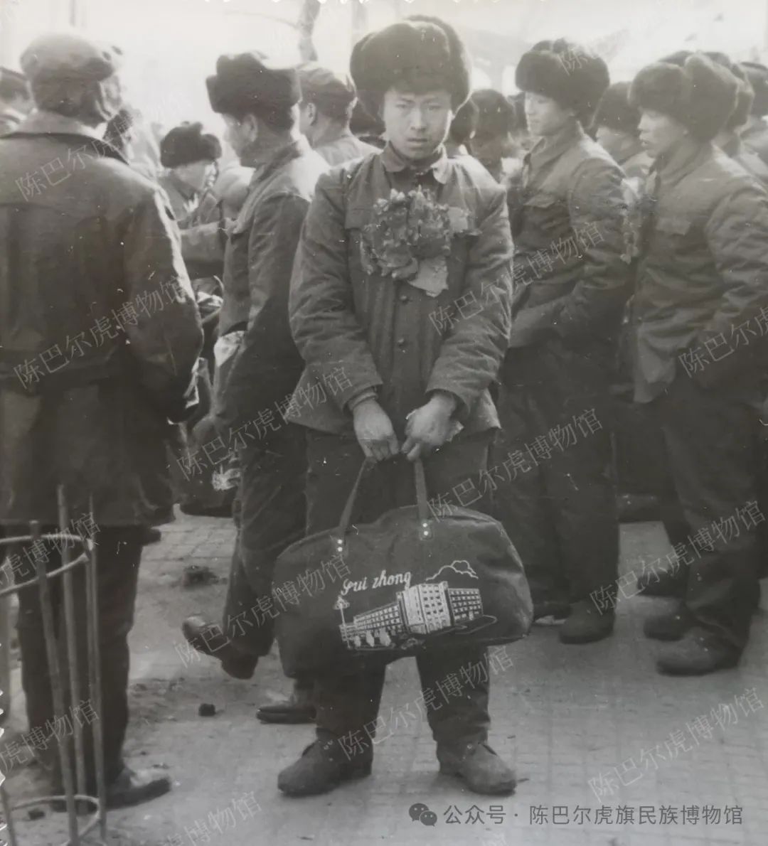 韩树文在车站排队等候上车,除了部队发的行李,随行的就一个提包,这是场部给三个新兵每人买了一个,算是特殊待遇。11月4日上午,旗委政府召开欢送大会,每名新兵佩戴大红花和有陈旗字样标志。旗人武部统一送新兵乘车前往海拉尔,中午在贝尔饭店呼伦贝尔籍新兵集体就餐,这也是韩树文长这么大第一次在大饭店吃到12个菜的大餐。饭后徒步前往火车站广场参加由盟里召开热烈的欢送新兵入伍大会。上千名新兵戴着大红花在排队等候上车,他们这批新兵需要换乘转2个班次列车,还得坐解放牌卡车穿越贺兰山和戈壁、腾格里沙漠,历时5天行程到达部队驻地苏宏图五团新兵二连。绿皮火车鸣笛要出发了,哈达图人武部长青巴图嘱托他的几个新兵到部队好好干不负家乡人民的期望。