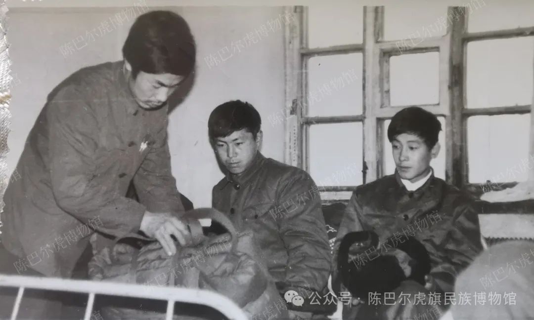 11月2日上午,当兵入伍临行前参加牧场组织的欢送会,三个新兵在会上向家乡的领导和亲人表决心。韩树文说:我一定不会辜负场领导对我们的殷切希望、不辜负家乡父老乡亲对我的期盼,到部队一定好好干,服从命令、听从指挥、不怕困难、不怕牺牲、不断进步,做一个对家乡、对社会有贡献的“四有”新人,看图上韩树文发言表情似乎斩钉截铁、心情澎湃。11月3日下午,图为新兵韩树文、刘卫东、白庆山从供销社采购物品出来时合影。新军帽轻轻戴在头上,似乎换了一个人,走路都很生涩和拘谨,难掩心中的喜悦和兴奋。 牧场武装部长青巴图一大早带队,由场部派车将新兵送到旗人武部报道集结,与接兵部队代表对接,新兵统一安排在旗服务行业招待所。下午,旗人武部给了他们半天时间去供销社采购牙膏等物品。新兵除了领章帽徽不发,发了一套军服、被子等物品,多余的东西不让带。今年征兵有一部分武警森警部队新兵,31名新兵去内蒙古阿拉善左旗中蒙边境驻防的中国人民解放军内蒙古军区边防五团服役,对外番号51307部队。入住招待所,军旅第一步整理内务,在陈旗服务行业招待所七十年代老兵教新兵如何打背包,进屋就开始“传帮带”了。