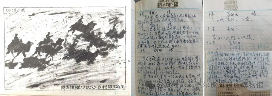 左图为韩树文写生挖药的驼队,右图为日记节选。1985年5月份韩树文所在三排八班挖锁阳、苁蓉日记。那时候部队允许搞点副业,但边远的大沙漠、戈壁滩没什么副业可搞,唯一资源盛产锁阳、苁蓉等药材,连队派战士到沙漠深处搭帐篷、骑着骆驼找药材挖,卖回来的钱改善连队伙食。