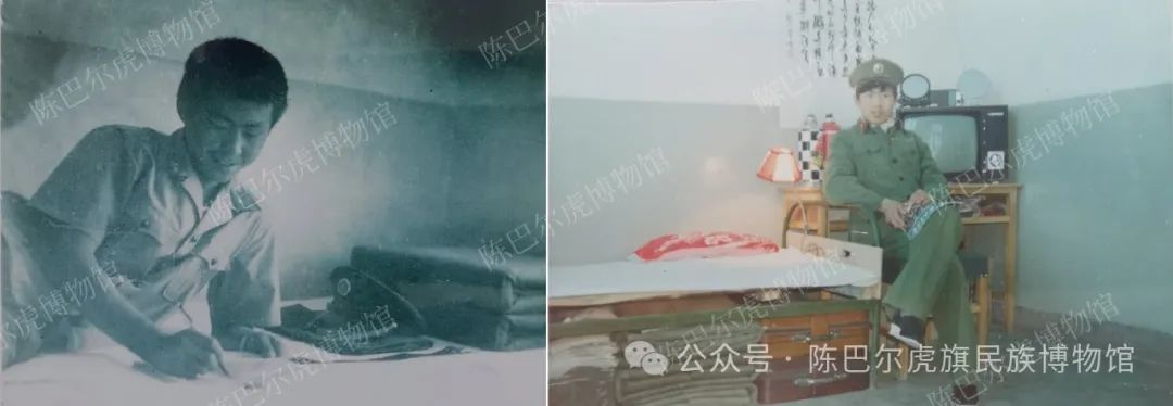左图为韩树文在宿舍;右图这时已经当了两年兵,有些老兵的派头了,看似生活工作很惬意。这时候在电影组,条件也好了、训练也少了,宿舍居然有电视可看。内务要求也看似没有新兵的严了,床下物品攒的也比新兵时多了。