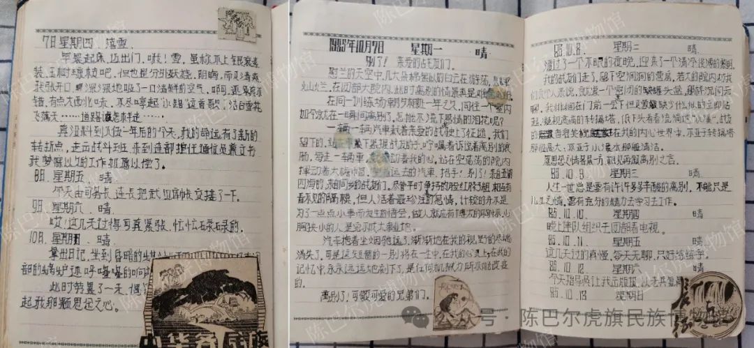 入伍第二年10月,韩树文到连部当通讯员、文书兼军械员,左图是刚当文书时张纪良指导员锻炼他,让他出一期纪念反法西斯战争胜利40周年的板报,费了大半天的时间在太阳快落山时终于完成任务,开心之余和板报合个影;右图是文书办公室、桌上摆镜子要时常正衣冠。1986年6月到了机关工作,在团政治处宣传股担任图书室管理员,《700里边防》小报刻版印刷工作。10月又担任团电影组放映员。经培训,35毫米和8毫米电影机各科目考试合格后发给电影放映操作证,在团礼堂开始进行全团电影放映和下一线连队放映工作,这时候彩色摄影开始普及了。左日记:入伍一年了,从战斗班到连部,虽然身兼数职,有机会学习文化了,日记里留下感言吧,字也写的似乎板正了;右日记:全训结束了,朝夕相处一年的战友们分别了,真是舍不得,看那几个模糊点可真是泪眼汪汪写的。