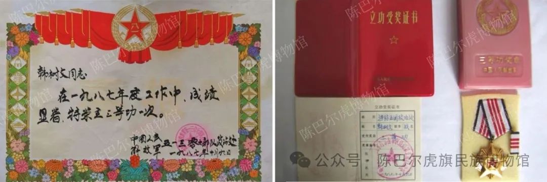 上世纪70年代,在风靡全国的电影《闪闪的红星》的影响下,生活在呼伦贝尔边陲牧场的小学生韩树文心中红五星闪耀着光辉伴随他成长。初中毕业那年飘雪的冬季,梦寐以求的红五星如愿眷顾了他住的泥土房。在收到入伍通知书后韩树文欣喜若狂,倍加珍惜荣誉,以日记和照相的形式开始记录了他参军入伍每一个环节。从欢送会开始,送站、离别、集训、学习、下连掌握军事技能、执勤、娱乐、学习军地两用特长、退伍、离别的军旅历程,在三年军营锤炼下从待业青年成长为一名合格的战斗班炮手、连队文书、团电影放映员。他记录的每一个画面代表了上世纪80年代广大解放军、武警战士响应祖国号召应征入伍的从军经历。虽然服役军兵种不同、地区不同、时代不同、但军人的使命和职责相承,与广大退伍军人的回忆相结,与初心齐鸣、与热血同涌、与情怀共勉。韩树文退伍后在平凡岗位上继续发扬我军优良传统,赓续荣光砥砺前行。因工作在边境地区长期从事和关注民兵预备役工作,坚持“传帮带”,做到“召之即来、来之能战,战之必胜”。他先后从事过基层专武干部、党务、工会、纪检监察等工作。这是陈巴尔虎旗哈达图牧场小学三年级学生1978年在庆六一儿童节时的合影。前排左三的小学生打扮很“军人”,解放帽和武装带是实打实真的军用品,似乎叫他兵哥哥都能应一声,他当兵的思想动机这时候已经萌芽了。哈达图牧场第七生产队有原沈阳军区1468部队的团部和营部驻防,那时军爱民、民拥军的氛围浓厚,部队官兵学习雷锋热情非常高,经常到驻地为老百姓排忧解难,老百姓也常去营部(后来也叫五七农场)看战斗题材电影。据韩树文说:《闪闪的红星》片中红军战士和潘东子的形象在我心中是那么高大,一颗红色的五角星在我心中闪着光辉!记得有个四川籍的滕姓兵来队里做好事和到供销社买东西时候比较多,一来二去和我们这帮小孩子混熟了,有时领我们去部队玩,到靶场捡子弹壳子弹尖。记得有一年夏天我和小伙伴李永学跟他去营部看电影,途经一条小河时他把我俩分别放到筐中挑过河的。后来感觉太熟了也就学着潘东子样子磨着他要个红五角星,他就逗我你抽几根旱烟卷我就给你一个,结果我还真的去抽了3根用作业本纸卷的很粗很长的烟卷。红五星是拿到手了,可也因抽烟抽醉了两天迷迷糊糊吃不下饭把胆汁都吐出来了,把不知原由的家人吓够呛,就有了至今不抽烟的习惯。这是1984年初冬入伍前拍的,这一年17岁。