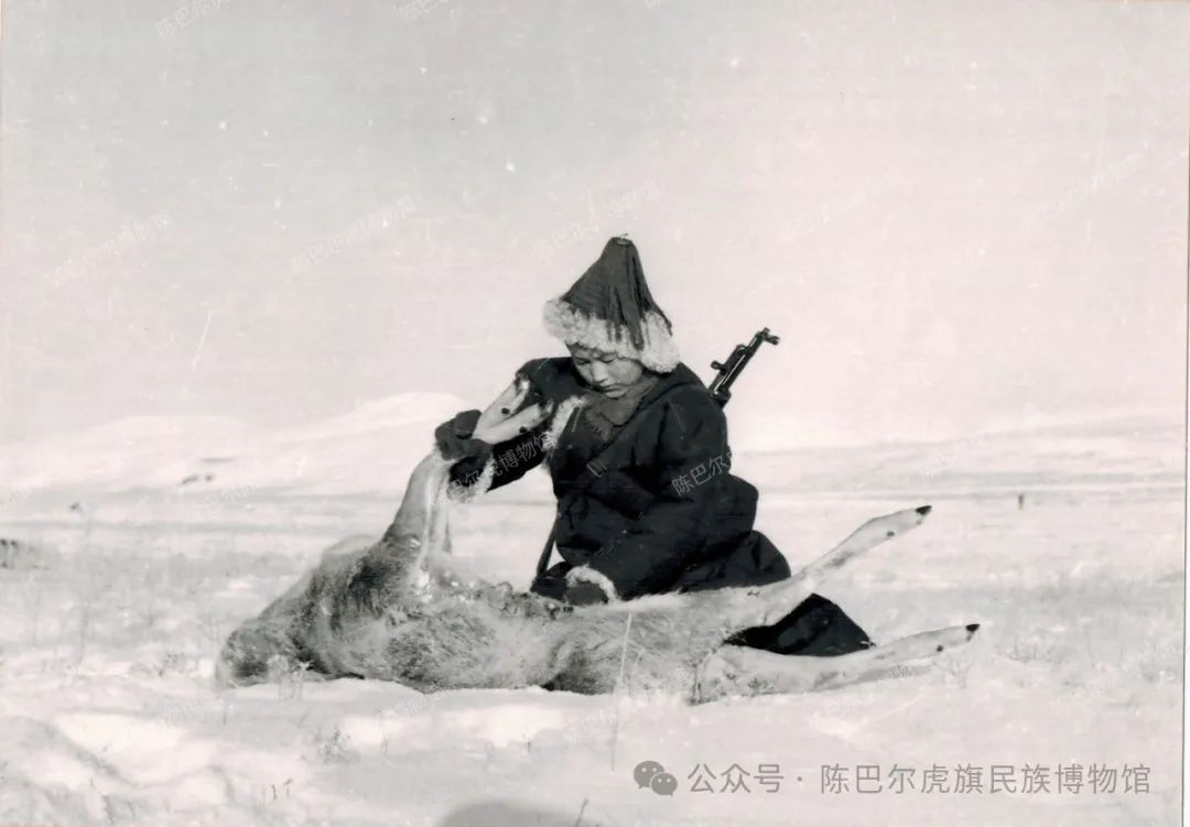 这只狍子冬季虽然掉了角,仍然能看出这是一只公狍子。小猎民带着传统的绍宝高日帽子,骑马时把帽耳放下来抵御严寒,打猎追踪时帽耳系在帽后,便于观察和不遮挡听觉。这种帽子和布里亚特帽子是一样的,帽尖上的红缨在雪地里格外鲜艳,尖顶象征大山,红缨象征太阳的光芒,有辟邪、朝气的寓意,是森林狩猎民族原生态信仰的记忆。新中国成立后莫尔格勒一带游牧的鄂温克人一走几个月的跨区游猎绝迹,加之畜牧业发展,均在苏木属地附近狩猎。进入上世纪60、70年代,半自动、全自动步枪用于狩猎后,较过去的别拉弹克、53式等单发步枪,狩猎效率大为提高,猎获增多。80年代后野宿狩猎消失,一般俩人结伴出猎,装具服饰也轻量化了,过去笨重的全皮的达库、木斯尼格等重型服饰不再狩猎时使用。![]()