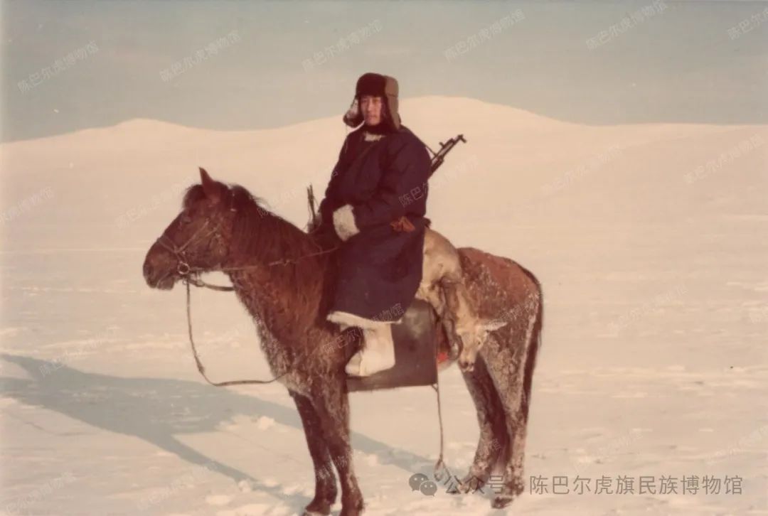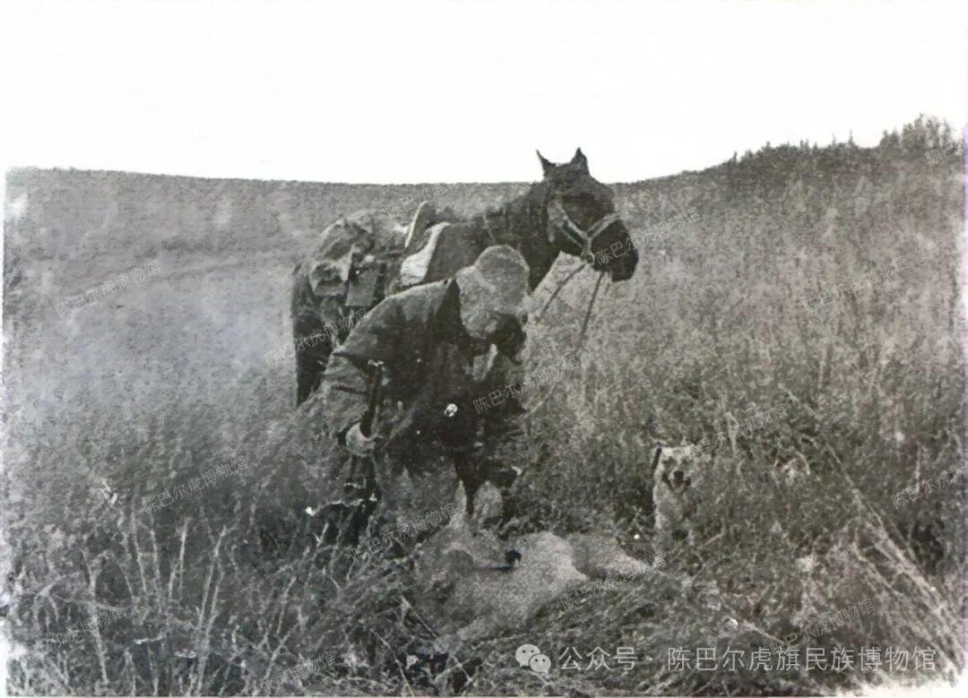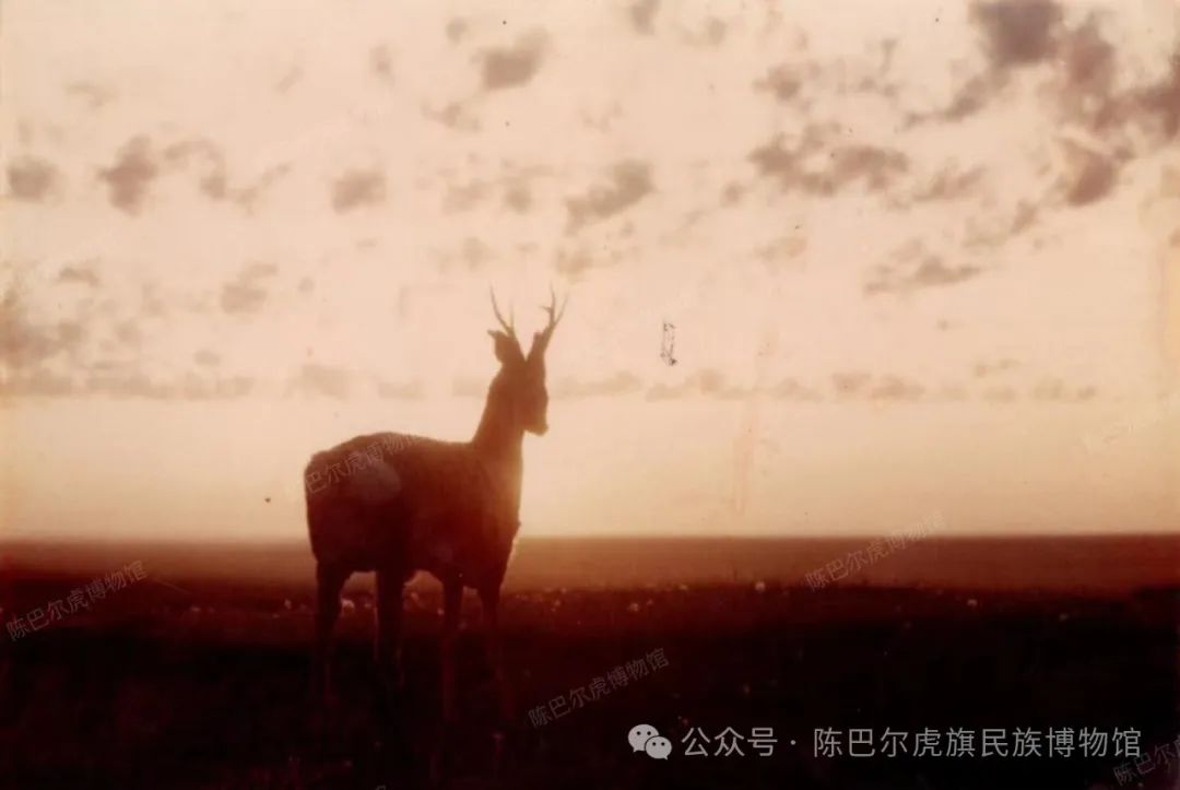 上世纪80年代初,时任鄂温克公社党委书记、民兵营长马日克在打狼归来,马上挂着一张灰狼皮,海泉跟随摄影。过去狼害是畜牧业主要灾害之一,草地牧民传统观念认为“狼是天狗”,对狼吃牲畜顺其自然,加之日本侵略者没收了牧民枪支,狼害一度泛滥。1948年9月3日中共呼盟工委书记吉雅泰在全盟首次那达慕大会上正式提出:“组织发动打狼,奖励成绩优良的苏木、巴嘎与个人”的号召后,盟、旗政府多次组织民兵打狼。据统计1948-1968年,狼害导致全旗损失牲畜16089头(只),上世纪70年代后,打狼陈旗还有20元的奖励。集体打狼多为追踪堵截射击或者掏狼窝。有记载1950年4月,完工公社人武部组织民兵突击队,采取挖洞灌水的方法打狼崽70多只,1964年冬,东、西乌珠尔民兵突击队使用步枪围猎打狼136只。过去“打狼模范”是劳动模范的一项,那达慕大会的专设奖项。1982年,摄影作品《又打到了一只狍子》布和楚鲁摄影,曾任旗文化馆馆长,画家、呼伦贝尔市摄影家协会主席。他的反映鄂温克民俗的摄影作品多次获自治区、国家级奖项,《去那达慕》在全国第十三届摄影艺术展览上获得银奖,也有摄影作品在美国等国家展出。他是本民族少数几个摄影家之一,留下了大量70、80年代的摄影作品。画面抓拍的狩猎场景是秋季的山谷里猎人携带着猎犬打猎。猎犬能帮助猎人找到躲在深草和密林中的猎物并牵制受伤猎物。特别是猎熊、野猪等猛兽要多携带几只猎犬。从马鞍可以看出是一位鄂温克猎人,鄂温克语叫宝尔吉额莫根。他们的马鞍前后桥尖圆,有大红和章丹色两种,边为绿色,和布里亚特鞍子是一样的,商品名为布里亚特鞍子。也是呼盟计划内少数民族特需用品,海拉尔民族用品厂生产的奔驰牌系列马鞍之一,也有牧民自制鞍子,但很少上油漆。这张照片是巴达玛苏荣1980年冬初拍摄,位置在今鄂温克民族苏木毕鲁图嘎查南,特尼河北的桦树林。拍完照片,枪声划过黄昏的天空,在山谷间回荡。这只公狍子的剪影定格在夕阳下的山岗上。