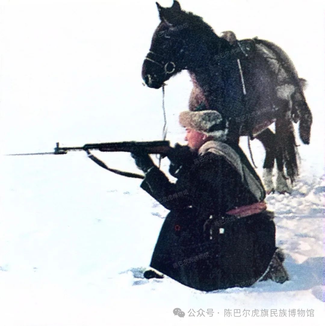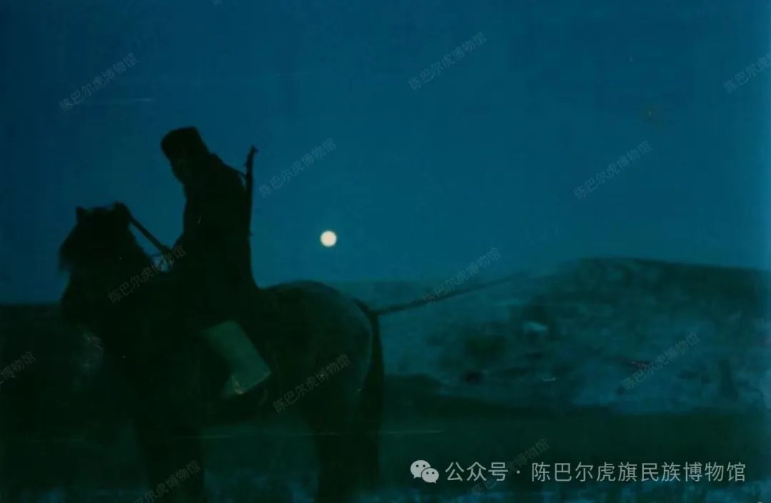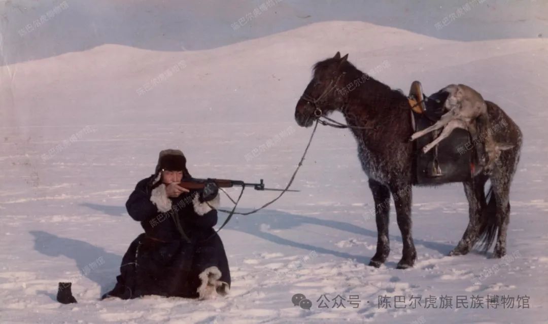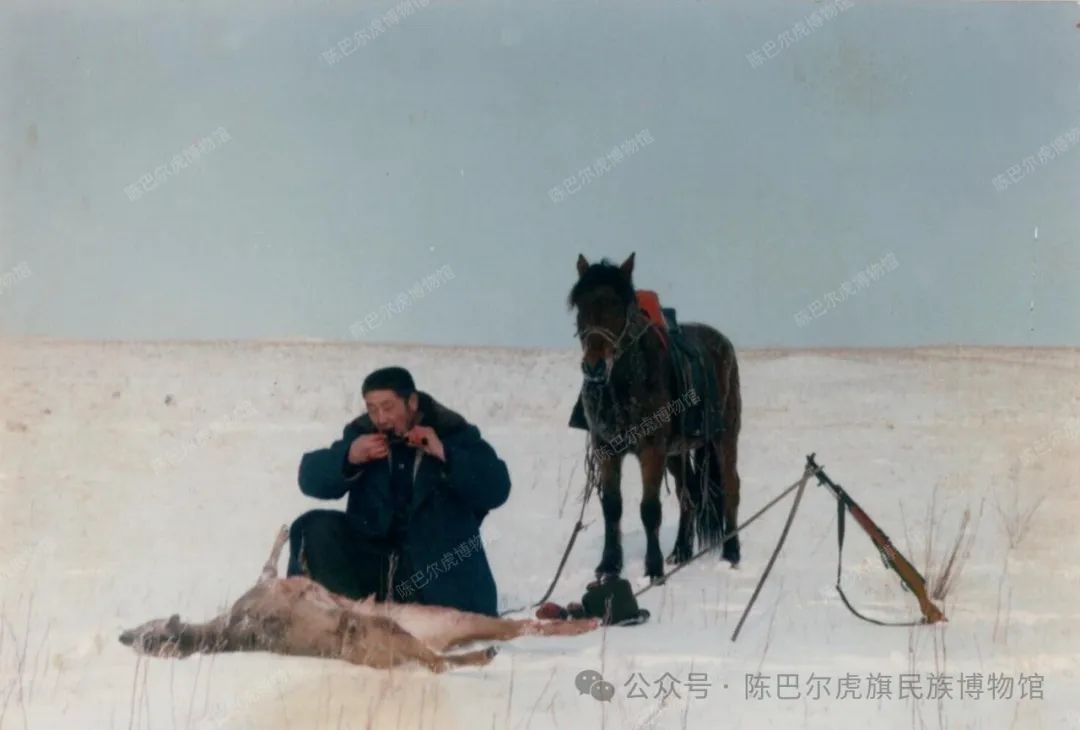他是公社民兵,使用配发的56式半自动步枪狩猎。从画面看猎人目光犀利,身体略前倾,枪和左小臂、左小腿在同一垂直面上,左右腿分开90度支撑,标准的我军跪姿据枪动作,这是长期民兵训练形成的固定动作。蒙古袍下和衣袖上有残留血迹,马上驮的狍子已经处理完内膛。猎人穿的“瓦令卡”(俄语,毡嘎达)是呼盟计划内生产的少数民族特需品之一,靴靿高口紧,轻便暖和。中东铁路修建后从俄罗斯传入东北,是牧区趟深雪专用靴,过去呼伦贝尔牧区皮毛企业均生产,仅陈旗皮毛厂就年产2500双,陈旗那吉的铁木社生产的毡嘎达最出名。上世纪60年代前鄂温克苏木的那吉和往里的阿森有几百户俄罗斯侨民居住。1980年冬季,海泉随行摄影。位置在那吉林场南侧的山坡,巴达玛苏荣打完一只狍子在吃肝,这是大兴安岭猎人的传统习俗,认为常吃生狍肝对眼睛有益处,成为具有“鹰一样的眼睛”的猎手。猎人也有生吃狍肾和旱獭胆的习俗。这座马鞍是巴尔虎鞍子,过去商品名叫八旗鞍子,根据尺寸分为大八旗(大官座)和小八旗(小官座),前桥立、后桥卧,黄色红边,前后桥都呈方圆形,清代皇族用的就是这种款式的鞍子。巴尔虎鞍子款式保持了戍边屯牧来时的原貌。上世纪90年代前,小八旗鞍子流行于新右旗、新左旗和陈旗,大八旗鞍子流行国营农牧场、边防和森警部队。1981年的冬天,猎民德力格尔在利用月色靠近猎物,位置在毕鲁图青根泉附近,同行的巴达玛苏荣使用彩色照相机拍摄。白桦林里黎明或日落时出猎主要打马鹿,采取蹲碱场、埋伏进出路径伏击或跟踪狩猎。发情期也使用鹿哨等辅助工具引诱。他们的眼睛超乎常人,能在黄昏、黎明甚至农历中旬满月期间的夜晚看清步枪的准星和猎物,照样打猎。猎人手里抓的是木头枪架“绍吉扬卡”(俄语),用于远距离射击猎物时稳定击发。大兴安岭里的鄂伦春、使鹿鄂温克等猎民从19世纪末使用燧石枪开始就用这种两根木头用皮绳子穿起来的枪架。